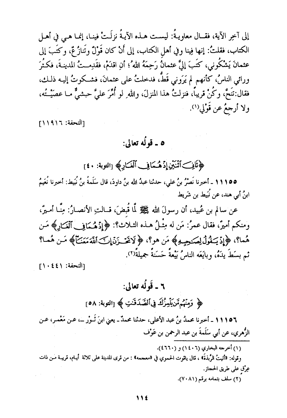 11154 - أَخْبَرَنَا أَبُو صَالِحٍ الْمَكِّيُّ، حَدَّثَنَا فُضَيْلُ يَعْنِي ابْنَ عِيَاضٍ، عَنْ حُصَيْنٍ، عَنْ زَيْدِ بْنِ وَهْبٍ، قَالَ: أَتَيْتُ الرَّبَذَةَ فَدَخَلْتُ عَلَى أَبِي ذَرٍّ فَقُلْتُ: مَا أَنْزَلَكَ هَذَا؟ قَالَ: كُنْتُ بِالشَّامِ فَقَرَأْتُ هَذِهِ الْآيَةَ {§وَالَّذِينَ يَكْنِزُونَ الذَّهَبَ وَالْفِضَّةَ وَلَا يُنْفِقُونَهَا} [التوبة: 34] إِلَى آخِرِ الْآيَةِ، فَقَالَ مُعَاوِيَةُ: لَيْسَتْ هَذِهِ الْآيَةُ نَزَلَتْ فِينَا، إِنَّمَا هِيَ فِي أَهْلِ الْكِتَابِ، فَقُلْتُ: إِنَّهَا فِينَا وَفِي أَهْلِ الْكِتَابِ، إِلَى أَنْ كَانَ قَوْلٌ وَتَنَازُعٌ، وَكَتَبَ إِلَى عُثْمَانَ يَشْكُونِي، كَتَبَ إِلَيَّ عُثْمَانُ رَحِمَهُ اللهُ أَنِ اقْدُمْ، فَقَدِمْتُ الْمَدِينَةَ فَكَثُرَ وَرَائِي النَّاسُ كَأَنَّهُمْ لَمْ يَرَوْنِي قَطُّ، فَدَخَلْتُ عَلَى عُثْمَانَ فَشَكَوْتُ إِلَيْهِ ذَلِكَ، فَقَالَ: تَنَحَّ، وَكُنْ قَرِيبًا، فَنَزَلْتُ هَذَا الْمَنْزِلَ، وَاللهِ لَوْ أُمِّرَ عَلَيَّ حَبَشِيٌّ مَا عَصَيْتُهُ وَلَا أَرْجِعُ عَنْ قَوْلِي "