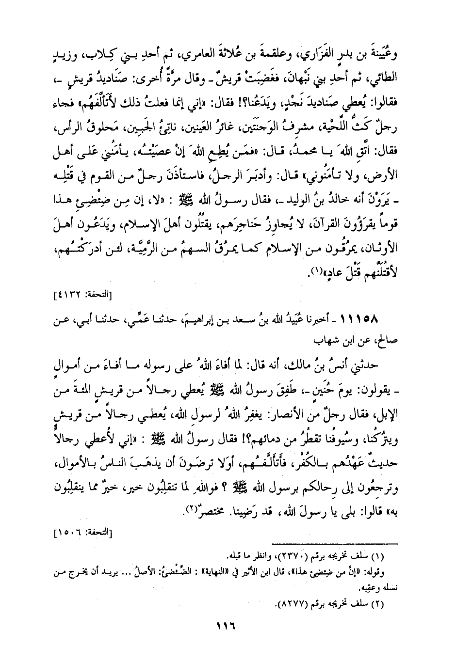11158 - أَخْبَرَنَا عُبَيْدُ اللهِ بْنُ سَعْدِ بْنِ إِبْرَاهِيمَ، حَدَّثَنَا عَمِّي، حَدَّثَنَا أَبِي، عَنْ صَالِحٍ، عَنِ ابْنِ شِهَابٍ، حَدَّثَنِي أَنَسُ بْنُ مَالِكٍ، أَنَّهُ قَالَ: لَمَّا أَفَاءَ اللهُ عَلَى رَسُولِهِ مَا أَفَاءَ مِنْ أَمْوَالٍ، يَقُولُونَ يَوْمَ حُنَيْنٍ: طَفِقَ رَسُولُ اللهِ صَلَّى اللهُ عَلَيْهِ وَسَلَّمَ يُعْطِي رِجَالًا مِنْ قُرَيْشٍ الْمِائَةَ مِنَ الْإِبِلِ فَقَالَ رَجُلٌ مِنَ الْأَنْصَارِ: يَغْفِرُ اللهُ لِرَسُولِ اللهِ يُعْطِي رِجَالًا مِنْ قُرَيْشٍ وَيَتْرُكُنَا، وَسُيُوفُنَا تَقْطُرُ مِنْ دِمَائِهِمْ؟ فَقَالَ رَسُولُ اللهِ صَلَّى اللهُ عَلَيْهِ وَسَلَّمَ: «§إِنِّي لَأُعْطِي رِجَالًا حَدِيثٌ عَهْدُهُمْ بِالْكُفْرِ فَأَتَأَلَّفُهُمْ، أَوَلَا تَرْضَوْنَ أَنْ يَذْهَبَ النَّاسُ بِالْأَمْوَالِ وَتَرْجِعُونَ إِلَى رِحَالِكُمْ بِرَسُولِ اللهِ صَلَّى اللهُ عَلَيْهِ وَسَلَّمَ، فَوَاللهِ لَمَا تَنْقَلِبُونَ خَيْرٌ، خَيْرٌ مِمَّا يَنْقَلِبُونَ بِهِ» قَالُوا: بَلَى يَا رَسُولَ اللهِ، قَدْ رَضِينَا مُخْتَصَرٌ