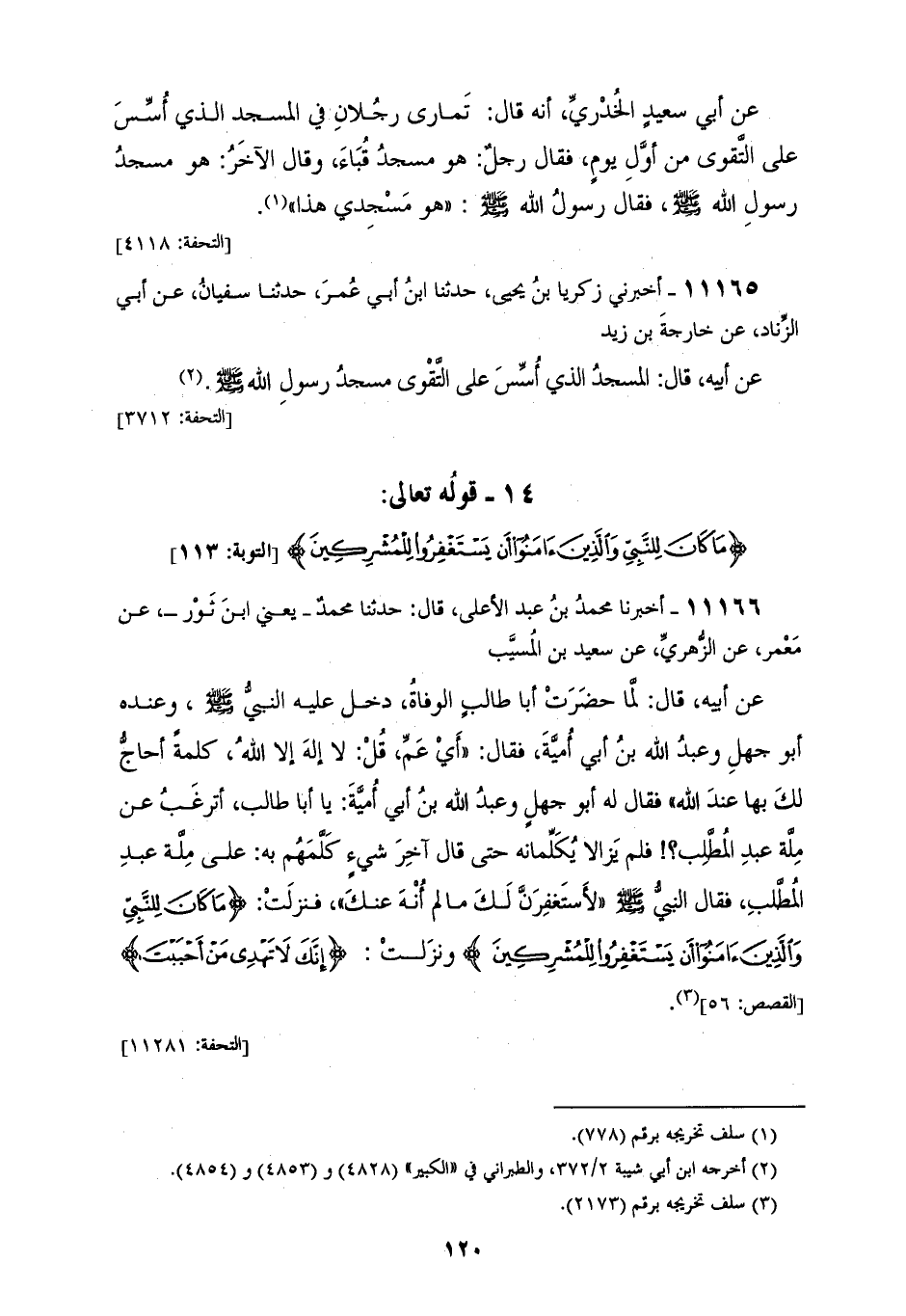11165 - أَخْبَرَنِي زَكَرِيَّا بْنُ يَحْيَى، حَدَّثَنَا ابْنُ أَبِي عُمَرَ، حَدَّثَنَا سُفْيَانُ، عَنْ أَبِي الزِّنَادِ، عَنْ خَارِجَةَ بْنِ زَيْدٍ، عَنْ أَبِيهِ، قَالَ: «§الْمَسْجِدُ الَّذِي أُسِّسَ عَلَى التَّقْوَى مَسْجِدُ رَسُولِ اللهِ صَلَّى اللهُ عَلَيْهِ وَسَلَّمَ»