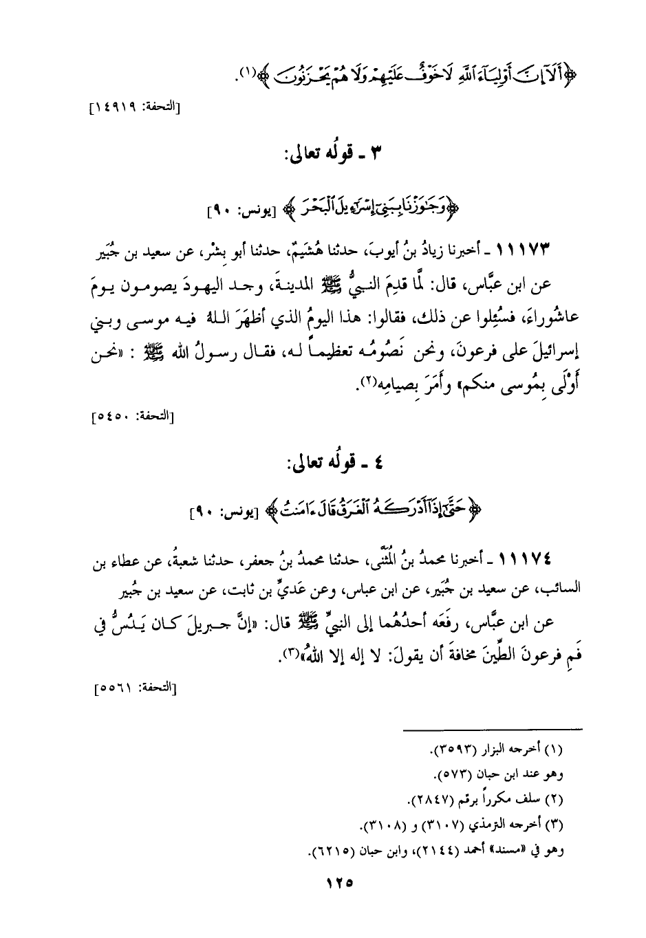 11173 - أَخْبَرَنَا زِيَادُ بْنُ أَيُّوبَ، حَدَّثَنَا هُشَيْمٌ، حَدَّثَنَا أَبُو بِشْرٍ، عَنْ سَعِيدِ بْنِ جُبَيْرٍ، عَنِ ابْنِ عَبَّاسٍ، قَالَ: لَمَّا قَدِمَ النَّبِيُّ صَلَّى اللهُ عَلَيْهِ وَسَلَّمَ الْمَدِينَةَ وَجَدَ الْيَهُودَ يَصُومُونَ يَوْمَ عَاشُورَاءَ، فَسُئِلُوا عَنْ ذَلِكَ فَقَالُوا: هَذَا الْيَوْمُ الَّذِي أَظْهَرَ اللهُ فِيهِ مُوسَى وَبَنِي إِسْرَائِيلَ عَلَى فِرْعَوْنَ، وَنَحْنُ نَصُومُهُ تَعْظِيمًا لَهُ، فَقَالَ رَسُولُ اللهِ صَلَّى اللهُ عَلَيْهِ وَسَلَّمَ: «§نَحْنُ أَوْلَى بِمُوسَى مِنْكُمْ، وَأَمَرَ بِصِيَامِهِ»