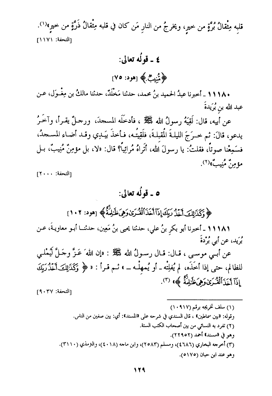 11181 - أَخْبَرَنَا أَبُو بَكْرِ بْنُ عَلِيٍّ، حَدَّثَنَا يَحْيَى بْنُ مَعِينٍ، حَدَّثَنَا أَبُو مُعَاوِيَةَ، عَنْ بُرَيْدٍ، عَنْ أَبِي بُرْدَةَ، عَنْ أَبِي مُوسَى، قَالَ: قَالَ رَسُولُ اللهِ صَلَّى اللهُ عَلَيْهِ وَسَلَّمَ: «إِنَّ §اللهَ عَزَّ وَجَلَّ لَيُمْلِي لِلظَّالِمِ حَتَّى إِذَا أَخَذَهُ لَمْ يُفْلِتْهُ - أَوْ يُمْهِلْهُ -» ثُمَّ قَرَأَ {وَكَذَلِكَ أَخْذُ رَبِّكَ إِذَا أَخَذَ الْقُرَى وَهِيَ ظَالِمَةٌ} [هود: 102]