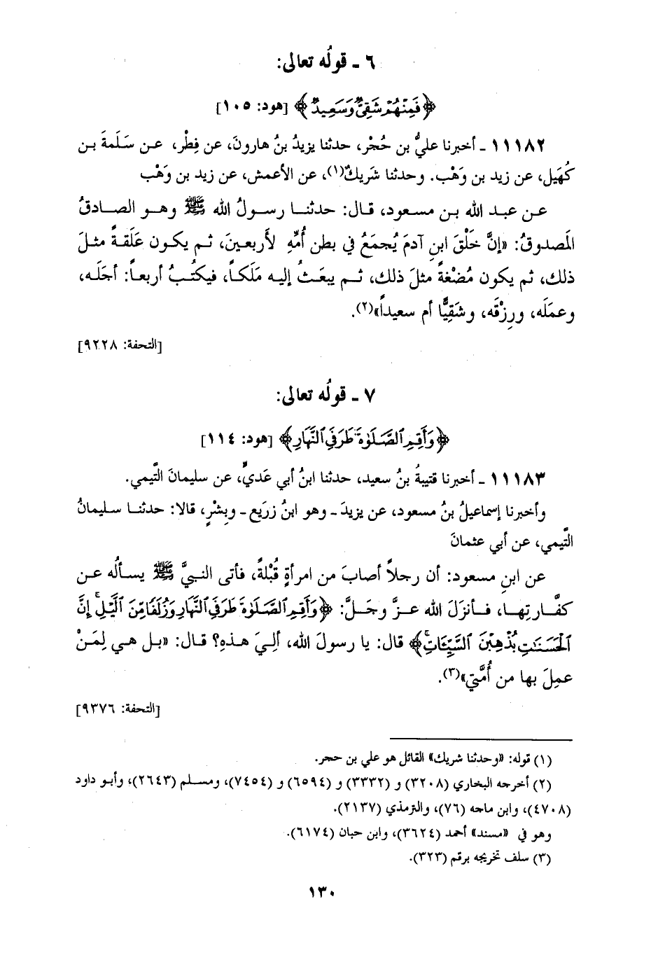 11183 - أَخْبَرَنَا قُتَيْبَةُ بْنُ سَعِيدٍ، حَدَّثَنَا ابْنُ أَبِي عَدِيٍّ، عَنْ سُلَيْمَانَ التَّيْمِيِّ، وَأَخْبَرَنَا إِسْمَاعِيلُ بْنُ مَسْعُودٍ، عَنْ يَزِيدَ وَهُوَ ابْنُ زُرَيْعٍ، وَبِشْرٍ، قَالَا: حَدَّثَنَا سُلَيْمَانُ التَّيْمِيُّ، عَنْ أَبِي عُثْمَانَ، عَنِ ابْنِ مَسْعُودٍ: أَنَّ رَجُلًا أَصَابَ مِنِ امْرَأَةٍ قُبْلَةً، فَأَتَى النَّبِيَّ صَلَّى اللهُ عَلَيْهِ وَسَلَّمَ يَسْأَلُهُ عَنْ كَفَّارَتِهَا، فَأَنْزَلَ اللهُ عَزَّ وَجَلَّ {§وَأَقِمِ الصَّلَاةَ طَرَفَيِ النَّهَارِ وَزُلَفًا مِنَ اللَّيْلِ إِنَّ الْحَسَنَاتِ يُذْهِبْنَ السَّيِّئَاتِ} [هود: 114]، قَالَ: يَا رَسُولَ اللهِ، أَلِي هَذِهِ؟ قَالَ: «بَلْ هِيَ لِمَنْ عَمِلَ بِهَا مِنْ أُمَّتِي»