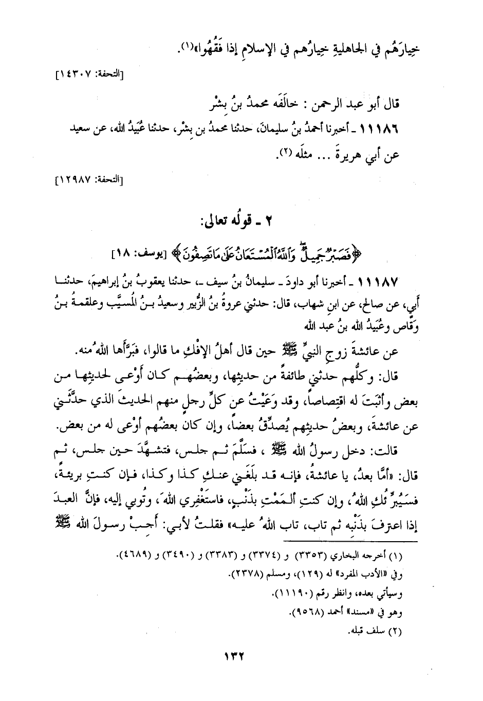11187 - أَخْبَرَنَا أَبُو دَاوُدَ سُلَيْمَانُ بْنُ سَيْفٍ، حَدَّثَنَا يَعْقُوبُ بْنُ إِبْرَاهِيمَ، حَدَّثَنَا أَبِي، عَنْ صَالِحٍ، عَنِ ابْنِ شِهَابٍ، قَالَ: حَدَّثَنِي عُرْوَةُ بْنُ الزُّبَيْرِ، وَسَعِيدُ بْنُ الْمُسَيَّبِ، وَعَلْقَمَةُ بْنُ وَقَّاصٍ، وَعُبَيْدُ اللهِ بْنُ عَبْدِ اللهِ، عَنْ عَائِشَةَ، زَوْجِ النَّبِيِّ صَلَّى اللهُ عَلَيْهِ وَسَلَّمَ حِينَ قَالَ أَهْلُ الْإِفْكِ مَا قَالُوا فَبَرَّأَهَا اللهُ مِنْهُ، قَالَ: وَكُلُّهُمْ حَدَّثَنِي طَائِفَةً مِنْ حَدِيثِهَا، وَبَعْضُهُمْ كَانَ أَوْعَى لِحَدِيثِهَا مِنْ بَعْضٍ، وَأَثْبَتَ لَهُ اقْتِصَاصًا، وَقَدْ وَعَيْتُ عَنْ كُلِّ رَجُلٍ مِنْهُمُ الْحَدِيثَ الَّذِي حَدَّثَنِي عَنْ عَائِشَةَ، وَبَعْضُ حَدِيثِهِمْ يُصَدِّقُ بَعْضًا، وَإِنْ كَانَ بَعْضُهُمْ أَوْعَى لَهُ مِنْ بَعْضٍ، قَالَتْ: دَخَلَ رَسُولُ اللهِ صَلَّى اللهُ عَلَيْهِ وَسَلَّمَ فَسَلَّمَ ثُمَّ جَلَسَ، فَتَشَهَّدَ حِينَ جَلَسَ ثُمَّ قَالَ: «أَمَّا بَعْدُ يَا عَائِشَةُ، فَإِنَّهُ §قَدْ بَلَغَنِي عَنْكِ كَذَا وَكَذَا، فَإِنْ كُنْتِ بَرِيئَةً فَسَيُبَرِّئُكِ اللهُ، وَإِنْ كُنْتِ أَلْمَمْتِ بِذَنْبٍ فَاسْتَغْفِرِي اللهَ وَتُوبِي إِلَيْهِ، فَإِنَّ الْعَبْدَ إِذَا اعْتَرَفَ بِذَنْبِهِ ثُمَّ تَابَ تَابَ اللهُ عَلَيْهِ» فَقُلْتُ لِأَبِي: أَجِبْ رَسُولَ اللهِ صَلَّى اللهُ عَلَيْهِ وَسَلَّمَ فِيمَا قَالَ، فَقَالَ: وَاللهِ مَا أَدْرِي مَا أَقُولُ لِرَسُولِ اللهِ صَلَّى اللهُ عَلَيْهِ وَسَلَّمَ، فَقُلْتُ لِأُمِّي: أَجِيبِي رَسُولَ اللهِ صَلَّى اللهُ عَلَيْهِ وَسَلَّمَ فِيمَا قَالَ، قَالَتْ: وَاللهِ مَا أَدْرِي مَا أَقُولُ لِرَسُولِ اللهِ صَلَّى اللهُ عَلَيْهِ وَسَلَّمَ -[133]-، فَقُلْتُ وَأَنَا جَارِيَةٌ حَدِيثَةُ السِّنِّ لَا أَقْرَأُ مِنَ الْقُرْآنِ كَثِيرًا: إِنِّي وَاللهِ لَقَدْ عَلِمْتُ لَقَدْ سَمِعْتُمْ هَذَا الْحَدِيثَ حَتَّى اسْتَقَرَّ فِي أَنْفُسِكُمْ وَصَدَّقْتُمْ بِهِ، فَلَئِنْ قُلْتُ لَكُمْ: إِنِّي بَرِيئَةٌ لَا تُصَدِّقُونِي، وَلَئِنِ اعْتَرَفْتُ لَكُمْ بِأَمْرٍ - وَاللهُ يَعْلَمُ أَنِّي مِنْهُ بَرِيئَةٌ - لَتُصَدُّقُنَّنِي، فَوَاللهِ مَا أَجِدُ لِي مَثَلًا وَلَا لَكُمْ إِلَّا أَبَا يُوسُفَ حِينَ قَالَ: {فَصَبْرٌ جَمِيلٌ وَاللهُ الْمُسْتَعَانُ عَلَى مَا تَصِفُونَ} [يوسف: 18] فَوَاللهِ مَا رَامَ رَسُولُ اللهِ صَلَّى اللهُ عَلَيْهِ وَسَلَّمَ مَجْلِسَهُ حَتَّى أَنْزَلَ اللهُ عَزَّ وَجَلَّ {إِنَّ الَّذِينَ جَاءُوا بِالْإِفْكِ عُصْبَةٌ مِنْكُمُ} الْعَشْرَ آيَاتٍ كُلَّهَا مُخْتَصَرٌ