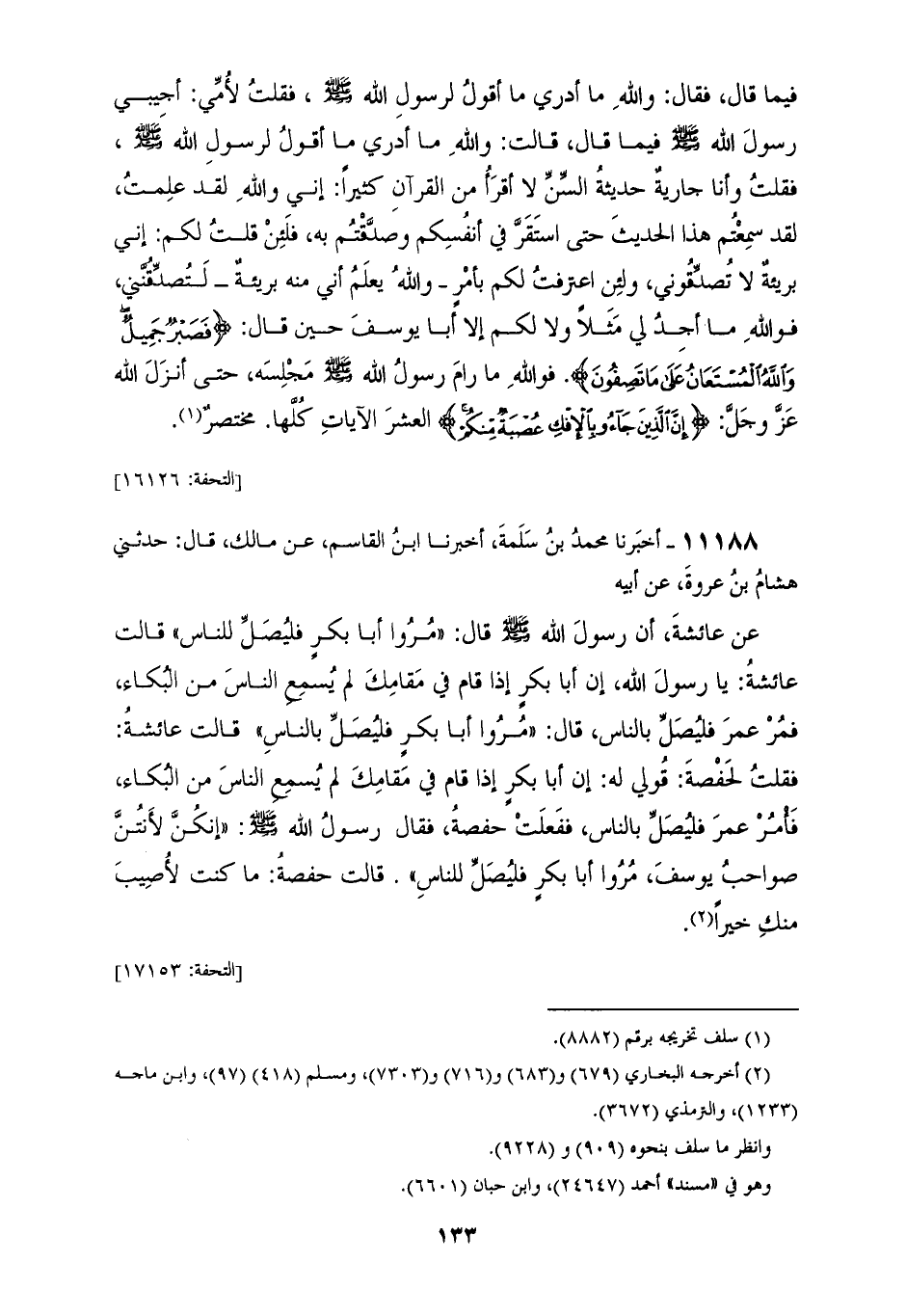 11188 - أَخْبَرَنَا مُحَمَّدُ بْنُ سَلَمَةَ، أَخْبَرَنَا ابْنُ الْقَاسِمِ، عَنْ مَالِكٍ، قَالَ: حَدَّثَنِي هِشَامُ بْنُ عُرْوَةَ، عَنْ أَبِيهِ، عَنْ عَائِشَةَ: أَنَّ رَسُولَ اللهِ صَلَّى اللهُ عَلَيْهِ وَسَلَّمَ قَالَ: «§مُرُوا أَبَا بَكْرٍ فَلْيُصَلِّ لِلنَّاسِ» قَالَتْ عَائِشَةُ: يَا رَسُولَ اللهِ، إِنَّ أَبَا بَكْرٍ إِذَا قَامَ فِي مَقَامِكَ لَمْ يُسْمِعِ النَّاسَ مِنَ الْبُكَاءِ، فَمُرْ عُمَرَ فَلْيُصَلِّ بِالنَّاسِ، قَالَ: «مُرُوا أَبَا بَكْرٍ فَلْيُصَلِّ بِالنَّاسِ» قَالَتْ عَائِشَةُ: فَقُلْتُ لِحَفْصَةَ: قُولِي لَهُ: إِنَّ أَبَا بَكْرٍ إِذَا قَامَ فِي مَقَامِكَ لَمْ يُسْمِعِ النَّاسَ مِنَ الْبُكَاءِ، فَأْمُرْ عُمَرَ فَلْيُصَلِّ بِالنَّاسِ، فَفَعَلَتْ حَفْصَةُ، فَقَالَ رَسُولُ اللهِ صَلَّى اللهُ عَلَيْهِ وَسَلَّمَ: «إِنَّكُنَّ لَأَنْتُنَّ صَوَاحِبُ يُوسُفَ، مُرُوا أَبَا بَكْرٍ فَلْيُصَلِّ لِلنَّاسِ» قَالَتْ حَفْصَةُ: مَا كُنْتُ لِأُصِيبَ مِنْكِ خَيْرًا