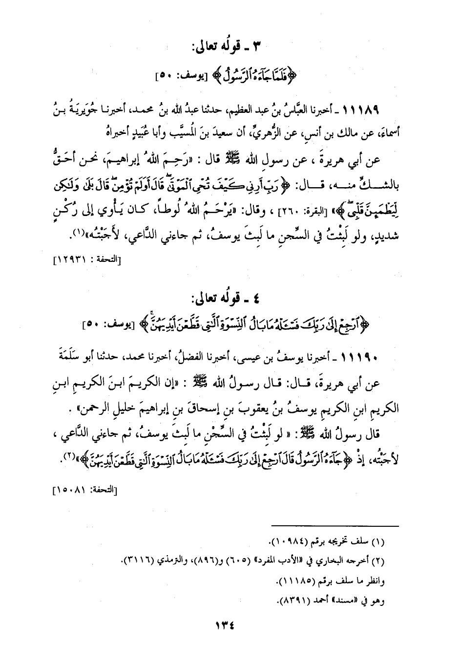 11190 - أَخْبَرَنَا يُوسُفُ بْنُ عِيسَى، أَخْبَرَنَا الْفَضْلُ، أَخْبَرَنَا مُحَمَّدٌ، حَدَّثَنَا أَبُو سَلَمَةَ، عَنْ أَبِي هُرَيْرَةَ، قَالَ: قَالَ رَسُولُ اللهِ صَلَّى اللهُ عَلَيْهِ وَسَلَّمَ: «إِنَّ §الْكَرِيمَ ابْنَ الْكَرِيمِ ابْنِ الْكَرِيمِ ابْنِ الْكَرِيمِ يُوسُفُ بْنُ يَعْقُوبَ بْنِ إِسْحَاقَ بْنِ إِبْرَاهِيمَ خَلِيلِ الرَّحْمَنِ» قَالَ رَسُولُ اللهِ صَلَّى اللهُ عَلَيْهِ وَسَلَّمَ: " لَوْ لَبِثْتُ فِي السِّجْنِ مَا لَبِثَ يُوسُفُ، ثُمَّ جَاءَنِي الدَّاعِي لَأَجَبْتُهُ إِذْ {جَاءَهُ الرَّسُولُ قَالَ ارْجِعْ إِلَى رَبِّكَ فَاسْأَلْهُ مَا بَالُ النِّسْوَةِ اللَّاتِي قَطَّعْنَ أَيْدِيَهُنَّ} [يوسف: 50]