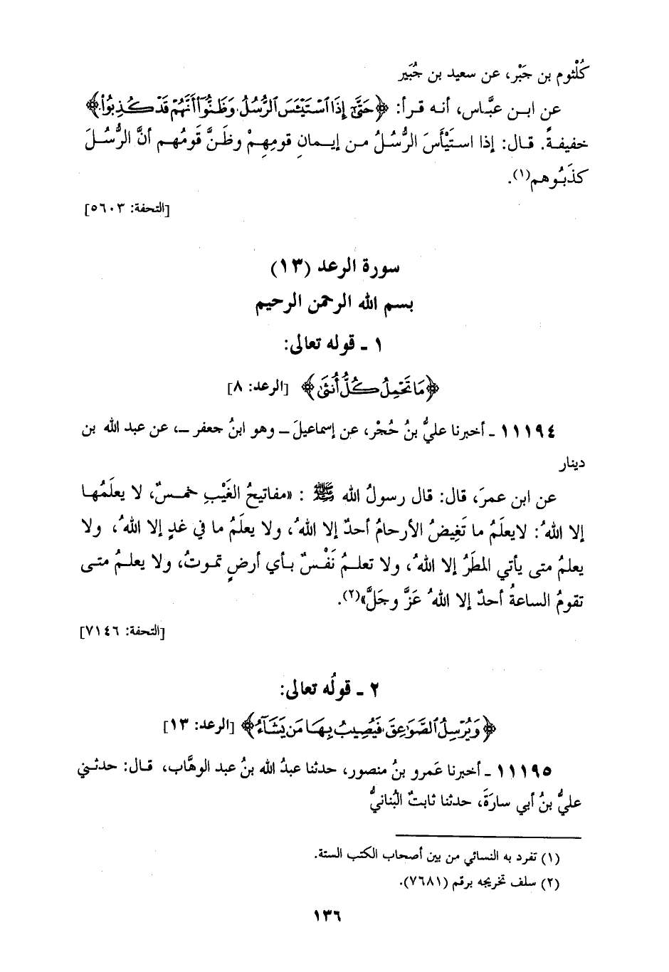 11194 - أَخْبَرَنَا عَلِيُّ بْنُ حُجْرٍ، عَنْ إِسْمَاعِيلَ وَهُوَ ابْنُ جَعْفَرٍ، عَنْ عَبْدِ اللهِ بْنِ دِينَارٍ، عَنِ ابْنِ عُمَرَ، قَالَ: قَالَ رَسُولُ اللهِ صَلَّى اللهُ عَلَيْهِ وَسَلَّمَ: «§مَفَاتِيحُ الْغَيْبِ خَمْسٌ لَا يَعْلَمُهَا إِلَّا اللهُ، لَا يَعْلَمُ مَا تَغِيضُ الْأَرْحَامُ أَحَدٌ إِلَّا اللهُ، وَلَا يَعْلَمُ مَا فِي غَدٍ إِلَّا اللهُ، وَلَا يَعْلَمُ مَتَى يَأْتِي الْمَطَرُ إِلَّا اللهُ، وَلَا تَعْلَمُ نَفْسٌ بِأَيِّ أَرْضٍ تَمُوتُ، وَلَا يَعْلَمُ مَتَى تَقُومُ السَّاعَةُ أَحَدٌ إِلَّا اللهُ عَزَّ وَجَلَّ»