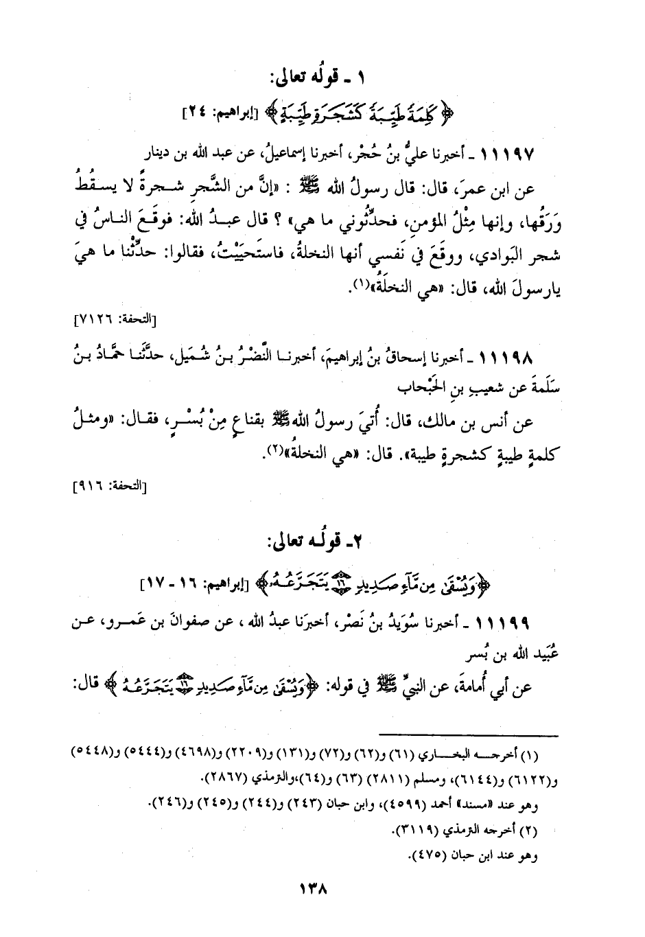 11198 - أَخْبَرَنَا إِسْحَاقُ بْنُ إِبْرَاهِيمَ، أَخْبَرَنَا النَّضْرُ بْنُ شُمَيْلٍ، حَدَّثَنَا حَمَّادُ بْنُ سَلَمَةَ، عَنْ شُعَيْبِ بْنِ الْحُبْحَابِ، عَنْ أَنَسِ بْنِ مَالِكٍ، قَالَ: أُتِيَ رَسُولُ اللهِ صَلَّى اللهُ عَلَيْهِ وَسَلَّمَ بِقِنَاعٍ مِنْ بُسْرٍ، فَقَالَ: " §وَمَثَلُ كَلِمَةً طَيِّبَةً كَشَجَرَةٍ طَيِّبَةٍ قَالَ: «هِيَ النَّخْلَةُ»