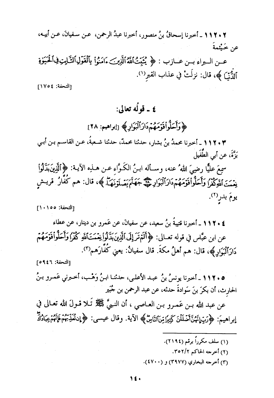 11204 - أَخْبَرَنَا قُتَيْبَةُ بْنُ سَعِيدٍ، عَنْ سُفْيَانَ، عَنْ عَمْرِو بْنِ دِينَارٍ، عَنْ عَطَاءٍ، عَنِ ابْنِ عَبَّاسٍ، فِي قَوْلِهِ تَعَالَى: {أَلَمْ تَرَ إِلَى الَّذِينَ بَدَّلُوا نِعْمَةَ اللهِ كُفْرًا وَأَحَلُّوا قَوْمَهُمْ دَارَ الْبَوَارِ} [إبراهيم: 28] قَالَ: «§هُمْ أَهْلُ مَكَّةَ» قَالَ سُفْيَانُ: يَعْنِي كُفَّارَهُمْ