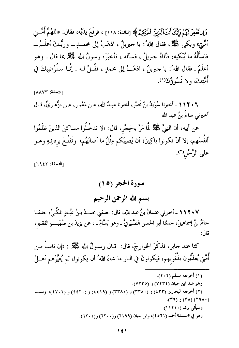 11207 - أَخْبَرَنِي عُثْمَانُ بْنُ عَبْدِ اللهِ، قَالَ: حَدَّثَنِي مُحَمَّدُ بْنُ عَبَّادٍ الْمَكِّيُّ، حَدَّثَنَا حَاتِمُ بْنُ إِسْمَاعِيلَ، حَدَّثَنَا أَبُو الْحَسَنِ الصَّيْرَفِيُّ وَهُوَ بَسَّامٌ، عَنْ يَزِيدَ بْنِ صُهَيْبٍ الْفَقِيرِ، قَالَ: كُنَّا عِنْدَ جَابِرٍ فَذَكَرَ الْخَوَارِجَ قَالَ: قَالَ رَسُولُ اللهِ صَلَّى اللهُ عَلَيْهِ وَسَلَّمَ: " إِنَّ §نَاسًا مِنْ أُمَّتِي يُعَذَّبُونَ بِذُنُوبِهِمْ، فَيَكُونُونَ فِي النَّارِ مَا شَاءَ اللهُ أَنْ يَكُونُوا، ثُمَّ يُعَيِّرُهُمْ أَهْلُ الشِّرْكِ فَيَقُولُونَ لَهُمْ: مَا نَرَى مَا كُنْتُمْ تُخَالِفُونَا فِيهِ مِنْ تَصْدِيقِكُمْ وَإِيْمَانِكُمْ نَفَعَكُمْ، لِمَا يُرِيدُ اللهُ أَنْ يُرِيَ أَهْلَ الشِّرْكِ مِنَ الْحَسْرَةِ، فَمَا يَبْقَى مُوَحِدٌ إِلَّا أَخْرَجَهُ اللهُ " ثُمَّ تَلَا رَسُولُ اللهِ صَلَّى اللهُ عَلَيْهِ وَسَلَّمَ هَذِهِ الْآيَةَ {رُبَمَا يَوَدُّ الَّذِينَ كَفَرُوا لَوْ كَانُوا مُسْلِمِينَ} [الحجر: 2]