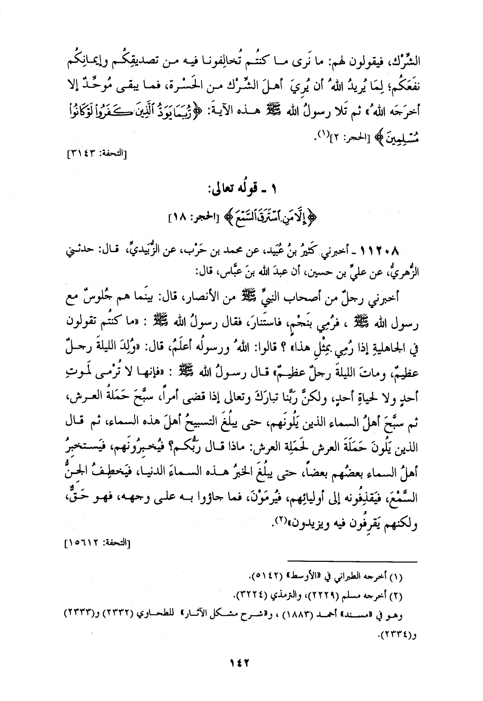 11208 - أَخْبَرَنِي كَثِيرُ بْنُ عُبَيْدٍ، عَنْ مُحَمَّدِ بْنِ حَرْبٍ، عَنِ الزُّبَيْدِيِّ، قَالَ: حَدَّثَنِي الزُّهْرِيُّ، عَنْ عَلِيِّ بْنِ حُسَيْنٍ: أَنَّ عَبْدَ اللهِ بْنَ عَبَّاسٍ، قَالَ: أَخْبَرَنِي رَجُلٌ، مِنْ أَصْحَابِ النَّبِيِّ صَلَّى اللهُ عَلَيْهِ وَسَلَّمَ مِنَ الْأَنْصَارِ قَالَ: بَيْنَمَا هُمْ جُلُوسٌ مَعَ رَسُولِ اللهِ صَلَّى اللهُ عَلَيْهِ وَسَلَّمَ فَرُمِيَ بِنَجْمٍ، فَاسْتَنَارَ، فَقَالَ رَسُولُ اللهِ صَلَّى اللهُ عَلَيْهِ وَسَلَّمَ: «§مَا كُنْتُمْ تَقُولُونَ فِي الْجَاهِلِيَّةِ إِذَا رُمِيَ بِمِثْلِ هَذَا؟» قَالُوا: اللهُ وَرَسُولُهُ أَعْلَمُ، قَالَ: «وُلِدَ اللَّيْلَةَ رَجُلٌ عَظِيمٌ، وَمَاتَ اللَّيْلَةَ رَجُلٌ عَظِيمٌ» قَالَ رَسُولُ اللهِ صَلَّى اللهُ عَلَيْهِ وَسَلَّمَ: " فَإِنَّهَا لَا تُرْمَى لِمَوْتِ أَحَدٍ، وَلَا لَحَيَاةِ أَحَدٍ، وَلَكِنَّ رَبَّنَا تَبَارَكَ وَتَعَالَى إِذَا قَضَى أَمْرًا سَبَّحَ حَمَلَةُ الْعَرْشِ، ثُمَّ سَبَّحَ أَهْلُ السَّمَاءِ الَّذِينَ يَلُونَهُمْ، حَتَّى يَبْلُغَ التَّسْبِيحُ أَهْلَ هَذِهِ السَّمَاءِ، ثُمَّ قَالَ الَّذِينَ يَلُونَ حَمَلَةَ الْعَرْشِ لِحَمَلَةِ الْعَرْشِ: مَاذَا قَالَ رَبُّكَمْ؟ فَيُخْبِرُونَهُمْ، فَيَسْتَخْبِرُ أَهْلُ السَّمَاءِ بَعْضُهُمْ بَعْضًا، حَتَّى يَبْلُغَ الْخَبَرُ هَذِهِ السَّمَاءَ الدُّنْيَا، فَيَخْطِفُ الْجِنُّ السَّمْعَ، فَيَقْذِفُونَهُ إِلَى أَوْلِيَائِهِمْ، فَيَرْمُونَ فَمَا جَاءُوا بِهِ عَلَى وَجْهِهِ، فَهُوَ حَقٌّ وَلَكِنَّهُمْ يَقْرِفُونَ فِيهِ وَيَزِيدُونَ "