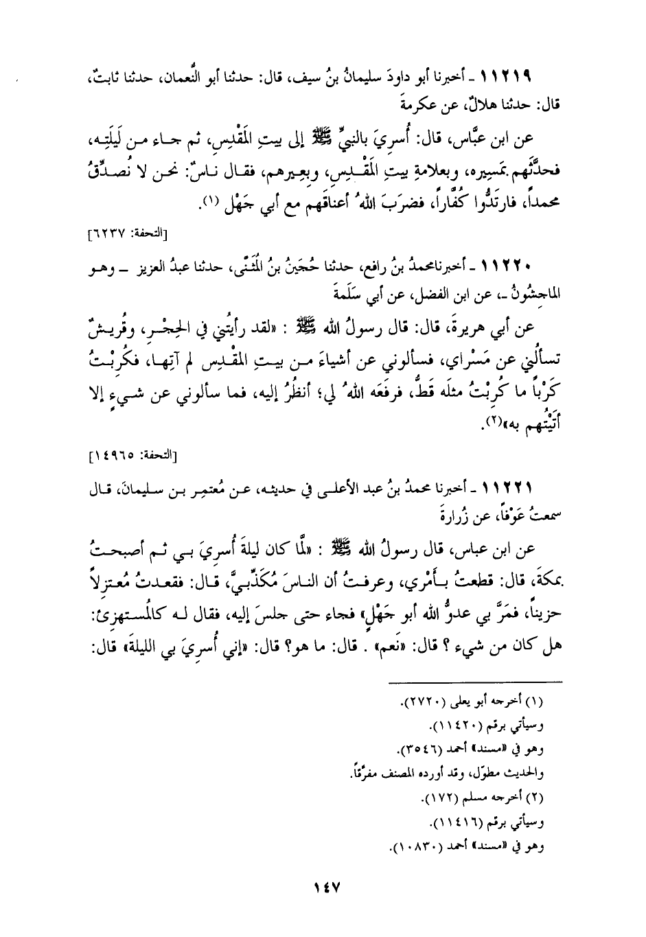 11221 - أَخْبَرَنَا مُحَمَّدُ بْنُ عَبْدِ الْأَعْلَى، فِي حَدِيثِهِ، عَنْ مُعْتَمِرِ بْنِ سُلَيْمَانَ، قَالَ: سَمِعْتُ عَوْفًا، عَنْ زُرَارَةَ، عَنِ ابْنِ عَبَّاسٍ، قَالَ رَسُولُ اللهِ صَلَّى اللهُ عَلَيْهِ وَسَلَّمَ: «§لَمَّا كَانَ لَيْلَةُ أُسْرِيَ بِي، ثُمَّ أَصْبَحْتُ بِمَكَّةَ» قَالَ: «قَطَعْتُ بِأَمْرِي وَعَرَفْتُ أَنَّ النَّاسَ مُكَذِّبِيَّ» قَالَ: «فَقَعَدْتُ مُعْتَزِلًا حَزِينًا، فَمَرَّ بِي عَدُوُّ اللهِ أَبُو جَهْلٍ» فَجَاءَ حَتَّى جَلَسَ إِلَيْهِ فَقَالَ لَهُ كَالْمُسْتَهْزِئِ: هَلْ كَانَ مِنْ شَيْءٍ؟ قَالَ: «نَعَمْ» قَالَ: مَا هُوَ؟ قَالَ: «إِنِّي أُسْرِيَ بِي اللَّيْلَةَ» قَالَ: إِلَى أَيْنَ؟ قَالَ: «إِلَى بَيْتِ الْمَقْدِسِ» قَالَ: ثُمَّ أَصْبَحْتَ بَيْنَ أَظْهُرِنَا؟ قَالَ: «نَعَمْ» -[148]- قَالَ: فَلَمْ يُرِهِ أَنَّهُ يُكَذِّبُهُ مَخَافَةَ أَنْ يَجْحَدَ الْحَدِيثَ إِنْ دَعَا لَهُ قَوْمَهُ، قَالَ: إِنْ دَعَوْتُ إِلَيْكَ قَوْمَكَ أَتُحَدِّثُهُمْ؟ قَالَ: «نَعَمْ» قَالَ أَبُو جَهْلٍ: مَعْشَرَ بَنِي كَعْبِ بْنِ لُؤَيٍّ، هَلُمَّ، فَتَنَفَّضَتِ الْمَجَالِسُ، فَجَاءُوا حَتَّى جَلَسُوا إِلَيْهِمَا، قَالَ: حَدِّثْ قَوْمَكَ مَا حَدَّثْتَنِي، قَالَ رَسُولُ اللهِ صَلَّى اللهُ عَلَيْهِ وَسَلَّمَ: «إِنِّي أُسْرِيَ بِي اللَّيْلَةَ» قَالُوا: إِلَى أَيْنَ؟ قَالَ: «إِلَى بَيْتِ الْمَقْدِسِ» قَالَ: قَالُوا: ثُمَّ أَصْبَحْتَ بَيْنَ أَظْهُرِنَا؟ قَالَ: «نَعَمْ» فَمِنْ بَيْنِ مُصَدَّقٍ، وَمِنْ بَيْنِ وَاضِعٍ يَدَهُ عَلَى رَأْسِهِ مُسْتَعْجِبًا لِلْكَذِبِ، قَالَ: وَفِي الْقَوْمِ مَنْ سَافَرَ إِلَى ذَلِكَ الْبَلَدِ، وَرَأَى الْمَسْجِدَ، قَالَ: قَالُوا: هَلْ تَسْتَطِيعُ أَنْ تَنْعَتَ لَنَا الْمَسْجِدَ؟ فَقَالَ رَسُولُ اللهِ صَلَّى اللهُ عَلَيْهِ وَسَلَّمَ: «فَذَهَبْتُ أَنْعَتُ لَهُمْ، فَمَا زِلْتُ أَنْعَتُ حَتَّى الْتَبَسَ عَلَيَّ بَعْضُ النَّعْتِ» قَالَ: «فَجِيءَ بِالْمَسْجِدِ حَتَّى وُضِعَ» قَالَ: «فَنَعَتُّ الْمَسْجِدَ وَأَنَا أَنْظُرُ إِلَيْهِ» قَالَ: وَقَدْ كَانَ مَعَ هَذَا حَدِيثٌ فَنَسِيتُهُ أَيْضًا، قَالَ الْقَوْمُ: أَمَّا النَّعْتُ فَقَدْ أَصَابَ