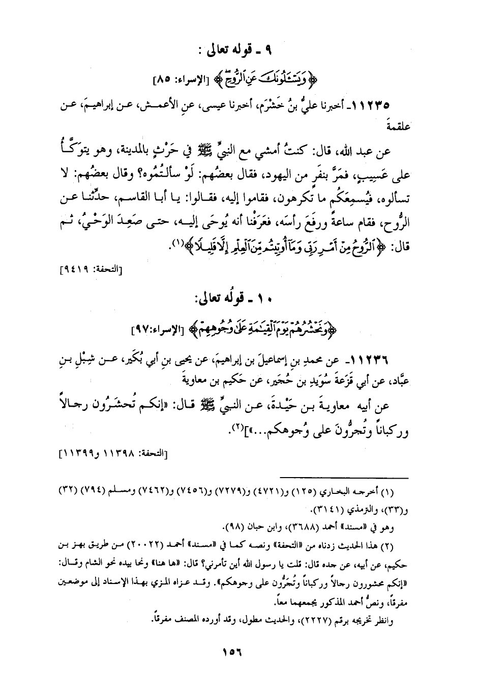 11236 - عَنْ مُحَمَّدِ بْنِ إِسمَاعِيلَ بْنِ إِبْرَاهِيمَ، عَنْ يَحْيَى بْنِ أَبِي بُكَيْرٍ، عِنْ شِبْلِ بْنِ عَبَّادٍ، عَنْ أَبِي قَزَعَةَ سُوَيْدِ بْنِ حُجَيْرٍ، عَنْ حَكِيمِ بْنِ مُعَاوِيَةَ، عَنْ أَبِيهِ مُعَاوِيَةَ بْنِ حَيْدَةَ، عَنِ النَّبِيِّ صَلَّى اللهُ عَلَيْهِ وَسَلَّمَ قَالَ: «§إِنَّكُمْ تُحْشَرُونَ رِجَالًا وَرُكْبَانًا وَتُجَرُّونَ عَلَى وُجُوهِكُمْ. . .»