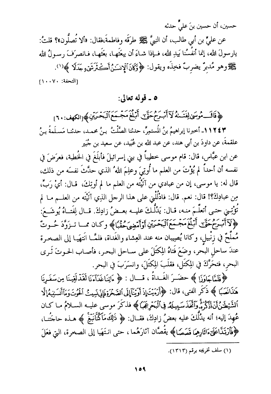 11243 - أَخْبَرَنَا إِبْرَاهِيمُ بْنُ الْمُسْتَمِرِّ، حَدَّثَنَا الصَّلْتُ بْنُ مُحَمَّدٍ، حَدَّثَنَا مَسْلَمَةُ بْنُ عَلْقَمَةَ، عَنْ دَاوُدَ بْنِ أَبِي هِنْدٍ، عَنْ عَبْدِ اللهِ بْنِ عُبَيْدٍ، عَنْ سَعِيدِ بْنِ جُبَيْرٍ، عَنِ ابْنِ عَبَّاسٍ، قَالَ: " قَامَ مُوسَى خَطِيبًا فِي بَنِي إِسْرَائِيلَ، فَأَبْلَغَ فِي الْخُطْبَةِ، فَعَرَضَ فِي نَفْسِهِ أَنَّ أَحَدًا لَمْ يُؤْتَ مِنَ الْعِلْمِ مَا أُوتِيَ، وَعَلِمَ اللهُ الَّذِي حَدَّثَ نَفْسَهُ مِنْ ذَلِكَ، قَالَ لَهُ: يَا مُوسَى، إِنَّ مِنْ عِبَادِي مِنْ آتَيْتُهُ مِنَ الْعِلْمِ مَا لَمْ أُوتِكَ، قَالَ: أَيْ رَبِّ، مِنْ عِبَادِكَ؟ قَالَ: نَعَمْ، قَالَ: فَادْلُلْنِي عَلَى هَذَا الرَّجُلِ الَّذِي آتَيْتَهُ مِنَ الْعِلْمِ مَا لَمْ تُؤْتِنِي حَتَّى أَتَعَلَّمَ مِنْهُ، قَالَ: يَدْلُكُ عَلَيْهِ بَعْضُ زَادِكَ، قَالَ لِفَتَاهُ يُوشَعَ: {لَا أَبْرَحُ حَتَّى أَبْلَغَ مَجْمَعَ الْبَحْرَيْنِ أَوْ أَمْضِيَ حُقُبًا} [الكهف: 60] وَكَانَ مِمَّا تَزَوَّدَ حُوتٌ مُمَلَّحٌ فِي زِنْبِيلٍ، وَكَانَا يُصِيبَانِ مِنْهُ عِنْدَ الْعِشَاءِ وَالْغَدَاةِ، فَلَمَّا انْتَهَيَا إِلَى الصَّخْرَةِ عِنْدَ سَاحِلِ الْبَحْرِ، وَضَعَ فَتَاهُ الْمِكْتَلَ عَلَى سَاحِلِ الْبَحْرِ، فَأَصَابَ الْحُوتُ ثَرَى الْبَحْرِ، فَتَحَرَّكَ فِي الْمِكْتَلِ فَقَلَبَ الْمِكْتَلَ وَانْسَرَبَ فِي الْبَحْرِ، فَلَمَّا جَاوَزَا حَضَرَ الْغَدَاةُ، قَالَ: {آتِنَا غَدَاءَنَا لَقَدْ لَقِينَا مِنْ سَفَرِنَا هَذَا نَصَبًا} [الكهف: 62] ذَكَرَ الْفَتَى قَالَ: {أَرَأَيْتَ إِذْ أَوَيْنَا إِلَى الصَّخْرَةِ فَإِنِّي نَسِيتُ الْحُوتَ وَمَا أَنْسَانِيهُ إِلَّا الشَّيْطَانُ أَنْ أَذْكُرَهُ، وَاتَّخَذَ سَبِيلَهُ فِي الْبَحْرِ عَجَبًا} [الكهف: 63] فَذَكَرَ مُوسَى عَلَيْهِ السَّلَامُ مَا كَانَ عُهِدَ إِلَيْهِ: أَنَّهُ يَدْلُكُ عَلَيْهِ بَعْضُ زَادِكَ، فَقَالَ: {ذَلِكَ مَا كُنَّا نَبْغِ} [الكهف: 64] هَذِهِ حَاجَتُنَا، {فَارْتَدَّا عَلَى آثَارِهِمَا قَصَصًا} [الكهف: 64] يَقُصَّانِ آثَارَهُمَا حَتَّى انْتَهَيَا إِلَى الصَّخْرَةِ الَّتِي فَعَلَ فِيهَا الْحُوتُ مَا فَعَلَ، وَأَبْصَرَ مُوسَى عَلَيْهِ السَّلَامُ أَثَرَ الْحُوتِ -[160]-، فَأَخَذَا إِثْرَ الْحُوتِ يَمْشِيَانِ عَلَى الْمَاءِ حَتَّى انْتَهَيَا إِلَى جَزِيرَةٍ مِنْ جَزَائِرِ الْبَحْرِ، {فَوَجَدَا عَبْدًا مِنْ عِبَادِنَا آتَيْنَاهُ رَحْمَةً مِنْ عِنْدَنَا وَعَلَّمْنَاهُ مِنْ لَدُنَّا عِلْمًا قَالَ لَهُ مُوسَى: هَلْ أَتَّبِعُكَ عَلَى أَنْ تُعَلِّمَنِ مِمَّا عُلِّمْتَ رُشْدًا قَالَ: إِنَّكَ لَنْ تَسْتَطِيعَ مَعِيَ صَبْرًا وَكَيْفَ تَصْبِرُ عَلَى مَا لَمْ تُحِطْ بِهِ خُبْرًا} [الكهف: 66] إِلَى قَوْلِهِ: {حَتَّى أُحْدِثَ لَكَ مِنْهُ ذِكْرًا} [الكهف: 70] أَيْ حَتَّى أَكُونَ أَنَا أُحْدِثُ لَكَ ذَلِكَ، {فَانْطَلَقَا حَتَّى إِذَا رَكِبَا فِي السَّفِينَةِ خَرَقَهَا} [الكهف: 71] إِلَى قَوْلِهِ: {فَانْطَلَقَا حَتَّى إِذَا لَقِيَا غُلَامًا} [الكهف: 74] عَلَى سَاحِلِ الْبَحْرِ غِلْمَانٌ يَلْعَبُونَ، فَعَهِدَ إِلَى أَصْبَحِهِمْ فَقَتَلَهُ، {قَالَ: أَقَتَلْتَ نَفْسًا زَكِيَّةً بِغَيْرِ نَفْسٍ لَقَدْ جِئْتَ شَيْئًا نُكْرًا قَالَ: أَلَمْ أَقُلْ لَكَ إِنَّكَ لَنْ تَسْتَطِيعَ مَعِيَ صَبْرًا} [الكهف: 74] قَالَ ابْنُ عَبَّاسٍ: فَقَالَ رَسُولُ اللهِ صَلَّى اللهُ عَلَيْهِ وَسَلَّمَ: " §فَاسْتَحْيَى عِنْدَ ذَلِكَ نَبِيُّ اللهِ مُوسَى صَلَّى اللهُ عَلَيْهِ وَسَلَّمَ فَقَالَ: {إِنْ سَأَلْتُكَ، عَنْ شَيْءٍ بَعْدَهَا فَلَا تُصَاحِبْنِي قَدْ بَلَغْتَ مِنْ لَدُنِّي عُذْرًا فَانْطَلَقَا حَتَّى إِذَا أَتَيَا أَهْلَ قَرْيَةٍ اسْتَطْعَمَا أَهْلَهَا فَأَبَوْا أَنْ يُضَيِّفُوهُمَا فَوَجَدَا فِيهَا جِدَارًا 