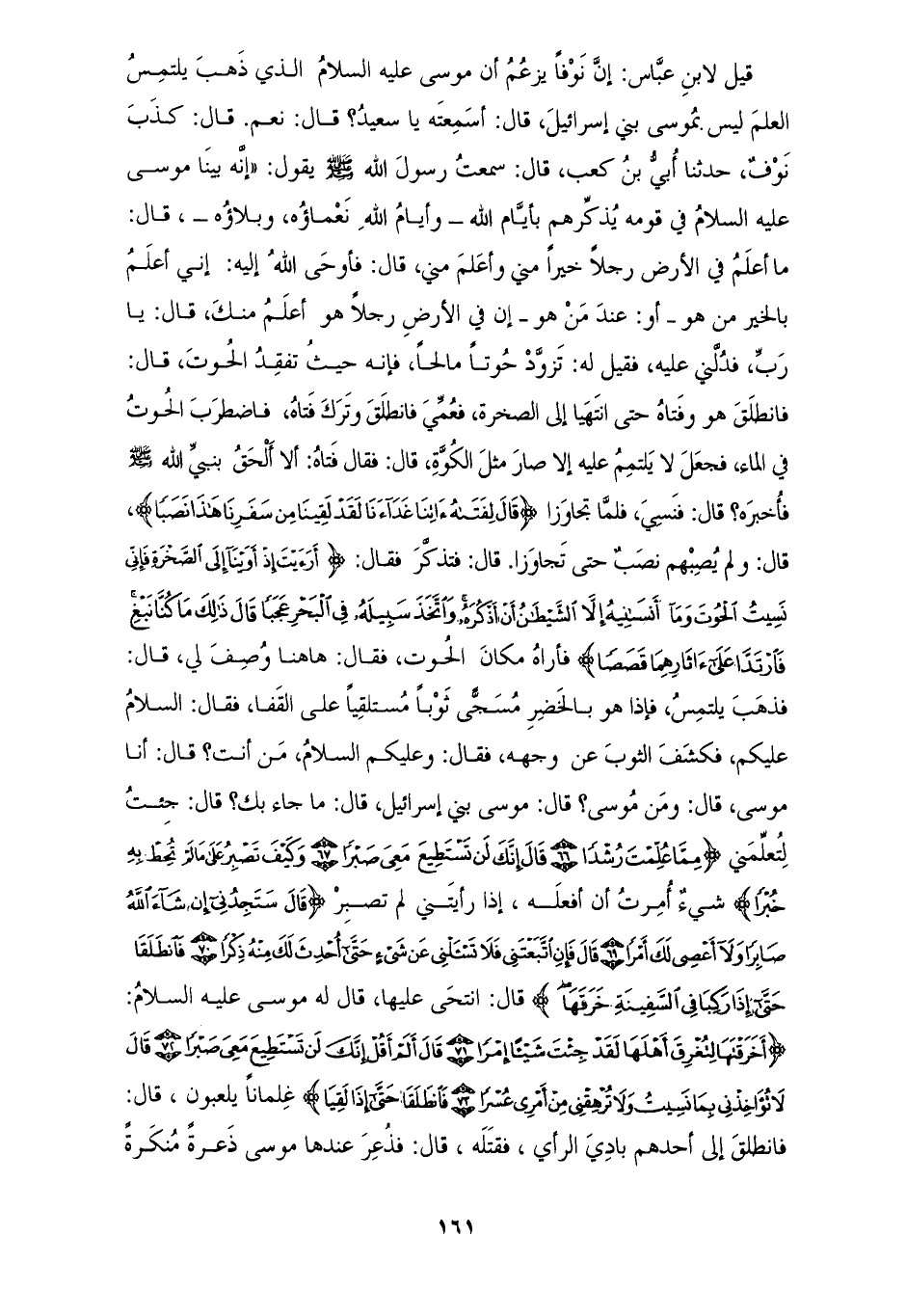 11244 - أَخْبَرَنَا مُحَمَّدُ بْنُ عَبْدِ الْأَعْلَى، حَدَّثَنَا الْمُعْتَمِرُ، عَنْ أَبِيهِ، عَنْ رَقَبَةَ، عَنْ أَبِي إِسْحَاقَ، عَنْ سَعِيدِ بْنِ جُبَيْرٍ، قَالَ: قِيلَ لِابْنِ عَبَّاسٍ: إِنَّ نَوْفًا يَزْعُمُ أَنَّ مُوسَى عَلَيْهِ السَّلَامُ الَّذِي ذَهَبَ يَلْتَمِسُ الْعِلْمَ لَيْسَ بِمُوسَى بَنِي إِسْرَائِيلَ، قَالَ: أَسَمِعْتَهُ يَا سَعِيدُ؟ قَالَ: نَعَمْ، قَالَ: كَذَبَ نَوْفٌ، حَدَّثَنَا أُبَيُّ بْنُ كَعْبٍ، قَالَ: سَمِعْتُ رَسُولَ اللهِ صَلَّى اللهُ عَلَيْهِ وَسَلَّمَ يَقُولُ: " إِنَّهُ §بَيْنَا مُوسَى عَلَيْهِ السَّلَامُ فِي قَوْمِهِ يُذَكِّرُهُمْ بِأَيَّامِ اللهِ، وَأَيَّامُ اللهِ نَعْمَاؤُهُ وَبَلَاؤُهُ، قَالَ: مَا أَعْلَمُ فِي الْأَرْضِ رَجُلًا خَيْرًا مِنِّي، وَأَعْلَمَ مِنِّي " قَالَ: " فَأَوْحَى اللهُ إِلَيْهِ: إِنِّي أَعْلَمُ بِالْخَيْرِ مِنْ هُوَ أَوْ: عِنْدَ مَنْ هُوَ؟ إِنَّ فِي الْأَرْضِ رَجُلًا هُوَ أَعْلَمُ مِنْكَ، قَالَ: يَا رَبِّ فَدُلَّنِي عَلَيْهِ، فَقِيلَ لَهُ: تَزَوَّدْ حُوتًا مَالِحًا، فَإِنَّهُ حَيْثُ تَفْقِدُ الْحُوتَ " قَالَ: «فَانْطَلَقَ هُوَ وَفَتَاهُ حَتَّى انْتَهَيَا إِلَى الصَّخْرَةِ، فَعُمِّيَ فَانْطَلَقَ وَتَرَكَ فَتَاهُ، فَاضْطَرَبَ الْحُوتُ فِي الْمَاءِ، فَجَعَلَ لَا يَلْتَمِمُ عَلَيْهِ إِلَّا صَارَ مِثْلَ الْكُوَّةِ» قَالَ: " فَقَالَ فَتَاهُ: أَلَا أَلْحَقُ بِنَبِيِّ اللهِ صَلَّى اللهُ عَلَيْهِ وَسَلَّمَ فَأُخْبِرُهُ؟ " قَالَ: " فَنَسِيَ، فَلَمَّا تَجَاوَزَا قَالَ لِفَتَاهُ {آتِنَا غَدَاءَنَا لَقَدْ لَقِينَا مِنْ سَفَرِنَا هَذَا نَصَبًا} [الكهف: 62] قَالَ: «وَلَمْ يُصِبْهُمْ نَصَبٌ حَتَّى تَجَاوَزَا» قَالَ: " فَتَذَكِّرَ فَقَالَ: {أَرَأَيْتَ إِذْ أَوَيْنَا إِلَى الصَّخْرَةِ فَإِنِّي نَسِيتُ الْحُوتَ وَمَا أَنْسَانِيهُ إِلَّا الشَّيْطَانُ أَنْ أَذْكُرَهُ وَاتَّخَذَ سَبِيلَهُ فِي الْبَحْرِ عَجَبًا قَالَ ذَلِكَ مَا كُنَّا نَبْغِ فَارْتَدَّا عَلَى آثَارِهِمَا قَصَصًا} [الكهف: 64] فَأُرَاهُ مَكَانَ الْحُوتِ، فَقَالَ: هَاهُنَا وُصِفَ لِي، قَالَ: فَذَهَبَ يَلْتَمِسُ فَإِذَا هُوَ بِالْخَضِرِ مُسَجًّى ثَوْبًا مُسْتَلْقِيًا عَلَى الْقَفَا، فَقَالَ: السَّلَامُ عَلَيْكُمْ، فَكَشَفَ الثَّوْبَ عَنْ وَجْهِهِ، فَقَالَ: وَعَلَيْكُمُ السَّلَامُ، مَنْ أَنْتَ؟ قَالَ: أَنَا مُوسَى، قَالَ: وَمَنْ مُوسَى؟ قَالَ: مُوسَى بَنِي إِسْرَائِيلَ، قَالَ: مَا جَاءَ بِكَ؟ قَالَ: جِئْتُ لِتُعَلِّمَنِي {مِمَّا عُلِّمْتَ رُشْدًا قَالَ إِنَّكَ لَنْ تَسْتَطِيعَ مَعِيَ صَبْرًا وَكَيْفَ تَصْبِرُ عَلَى مَا لَمْ تُحِطْ بِهِ خُبْرًا} [الكهف: 66] شَيْءٌ أُمِرْتُ أَنْ أَفْعَلَهُ، إِذَا رَأَيْتَنِي لَمْ تَصْبِرْ {قَالَ سَتَجِدُنِي إِنْ شَاءَ اللهُ صَابِرًا وَلَا أَعْصِي لَكَ أَمْرًا -[162]- قَالَ فَإِنِ اتَّبَعْتَنِي فَلَا تَسْأَلْنِي عَنْ شَيْءٍ حَتَّى أُحْدِثَ لَكَ مِنْهُ ذِكْرًا فَانْطَلَقَا حَتَّى إِذَا رَكِبَا فِي السَّفِينَةِ خَرَقَهَا} [الكهف: 69] قَالَ: انْتَحَى عَلَيْهَا، قَالَ لَهُ مُوسَى عَلَيْهِ السَّلَامُ: {أَخَرَقْتَهَا لِتُغْرِقَ أَهْلَهَا لَقَدْ جِئْتَ شَيْئًا إِمْرًا قَالَ أَلَمْ أَقُلْ إِنَّكَ لَنْ تَسْتَطِيعَ مَعِيَ صَبْرًا قَالَ لَا تُؤَاخِذْنِي بِمَا نَسِيتُ وَلَا تُرْهِقْنِي مِنْ أَمْرِي عُسْرًا فَانْطَلَقَا حَتَّى إِذَا لَقِيَا} [الكهف: 71] غِلْمَانًا يَلْعَبُونَ، قَالَ: فَانْطَلَقَ إِلَى أَحَدِهِمْ بَادِيَ الرَّأْيِ فَقَتَلَهُ، قَالَ: فَذُعِرَ عِنْدَهَا مُوسَى ذَعْرَةً مُنْكَرَةً {قَالَ أَقَتَلْتَ نَفْسًا زَكِيَّةً بِغَيْرِ نَفْسٍ لَقَدْ جِئْتَ شَيْئًا نُكْرًا} [الكهف: 74] فَقَالَ رَسُولُ اللهِ صَلَّى اللهُ عَلَيْهِ وَسَلَّمَ: «عِنْدَ هَذَا الْمَكَانِ رَحْمَةُ اللهِ عَلَي