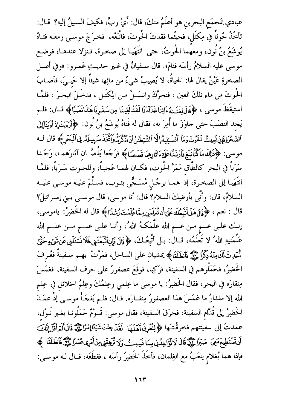 11245 - أَخْبَرَنَا قُتَيْبَةُ بْنُ سَعِيدٍ، فِي حَدِيثِهِ، عَنْ سُفْيَانَ، عَنْ عَمْرٍو، عَنْ سَعِيدِ بْنِ جُبَيْرٍ، قَالَ: قُلْتُ لِابْنِ عَبَّاسٍ: إِنَّ نَوْفًا الْبَكَالِيَّ يَزْعُمُ أَنَّ مُوسَى بَنِي إِسْرَائِيلَ لَيْسَ بِمُوسَى الْخَضِرِ، قَالَ: كَذَبَ عَدُوُّ اللهِ، حَدَّثَنَا أُبَيُّ بْنُ كَعْبٍ، عَنْ رَسُولِ اللهِ صَلَّى اللهُ عَلَيْهِ وَسَلَّمَ قَالَ: " §قَامَ مُوسَى عَلَيْهِ السَّلَامُ خَطِيبًا فِي بَنِي إِسْرَائِيلَ فَقِيلَ لَهُ: أَيُّ النَّاسِ أَعْلَمُ؟ قَالَ: أَنَا، قَالَ: فَعَتَبَ اللهُ عَلَيْهِ إِذْ لَمْ يَرُدَّ الْعِلْمَ إِلَيْهِ، فَأَوْحَى اللهُ إِلَيْهِ: بَلْ عَبْدٌ مِنْ عِبَادِي بِمَجْمَعِ الْبَحْرَيْنِ هُوَ أَعْلَمُ مِنْكَ، قَالَ: أَيْ رَبِّ، فَكَيْفَ السَّبِيلُ إِلَيْهِ؟ قَالَ: تَأْخُذُ حُوتًا فِي مِكْتَلٍ فَحَيْثُمَا فَقَدْتَ الْحُوتَ فَاتْبَعْهُ، فَخَرَجَ مُوسَى وَمَعَهُ فَتَاهُ يُوشَعُ بْنُ نُونٍ وَمَعَهُمَا الْحُوتُ، حَتَّى انْتَهَيَا إِلَى صَخْرَةٍ فَنَزَلَا عِنْدَهَا، فَوَضَعَ مُوسَى عَلَيْهِ السَّلَامُ رَأْسَهُ فَنَامَ، قَالَ سُفْيَانُ فِي غَيْرِ حَدِيثِ عَمْرٍو: وَفِي أَصْلِ الصَّخْرَةِ عَيْنٌ يُقَالُ لَهَا الْحَيَاةُ، لَا يُصِيبُ شَيْءٌ مِنْ مَائِهَا شَيْئًا إِلَّا حَيِيَ، فَأَصَابَ الْحُوتُ مِنْ مَاءِ تِلْكَ الْعَيْنِ، فَتَحَرَّكَ وَانْسَلَّ مِنَ الْمِكْتَلِ فَدَخَلَ الْبَحْرَ، فَلَمَّا اسْتَيْقَظَ مُوسَى قَالَ لِفَتَاهُ: {آتِنَا غَدَاءَنَا لَقَدْ لَقِينَا مِنْ سَفَرِنَا هَذَا نَصَبًا} [الكهف: 62] قَالَ: فَلَمْ يَجِدِ النَّصَبَ حَتَّى جَاوَزَ مَا أُمِرَ بِهِ، فَقَالَ لَهُ فَتَاهُ يُوشَعُ بْنُ نُونٍ: {أَرَأَيْتَ إِذْ أَوَيْنَا إِلَى الصَّخْرَةِ فَإِنِّي نَسِيتُ الْحُوتَ وَمَا أَنْسَانِيهُ إِلَّا الشَّيْطَانُ أَنْ أَذْكُرَهُ وَاتَّخَذَ سَبِيلَهُ فِي الْبَحْرِ} [الكهف: 63] قَالَ لَهُ مُوسَى: {ذَلِكَ مَا كُنَّا نَبْغِ فَارْتَدَّا عَلَى آثَارِهِمَا قَصَصًا} [الكهف: 64] فَرَجَعَا يَقُصَّانِ آثَارَهُمَا وَجَدَا سَرَبًا فِي الْبَحْرِ كَالطَّاقِ مَمَرَّ الْحُوتِ، فَكَانَ لَهُمَا عَجَبًا وَلِلْحُوتِ سَرَبًا، فَلَمَّا انْتَهَيَا إِلَى الصَّخْرَةِ إِذَا هُمَا بِرَجُلٍ مُسَجًّى بِثَوْبٍ، فَسَلَّمَ عَلَيْهِ مُوسَى عَلَيْهِ السَّلَامُ، قَالَ: وَأَنَّى بِأَرْضِكَ السَّلَامُ؟ -[164]- قَالَ: أَنَا مُوسَى، قَالَ: مُوسَى بَنِي إِسْرَائِيلَ؟ قَالَ: نَعَمْ، قَالَ: {هَلْ أَتَّبِعُكَ عَلَى أَنْ تُعَلِّمَنِ مِمَّا عُلِّمْتَ رُشْدًا} [الكهف: 66] قَالَ لَهُ الْخَضِرُ: يَا مُوسَى إِنَّكَ عَلَى عِلْمٍ مِنْ عِلْمِ اللهِ عَلَّمَكَهُ اللهُ، وَأَنَا عَلَى عِلْمٍ مِنْ عِلْمِ اللهِ عَلَّمَنِيهِ اللهُ لَا تَعْلَمُهُ، قَالَ: بَلْ أَتَّبِعُكَ، قَالَ: {فَإِنِ اتَّبَعْتَنِي فَلَا تَسْأَلْنِي عَنْ شَيْءٍ حَتَّى أُحْدِثَ لَكَ مِنْهُ ذِكْرًا فَانْطَلَقَا} [الكهف: 71] يَمْشِيَانِ عَلَى السَّاحِلِ فَمَرَّتْ بِهِمْ سَفِينَةٌ فَعُرِفَ الْخَضِرُ فَحَمَلُوهُمْ فِي السَّفِينَةِ، فَرَكِبَا فَوَقَعَ عُصْفُورٌ عَلَى حَرْفِ السَّفِينَةِ فَغَمَسَ مِنْقَارَهُ فِي الْبَحْرِ، فَقَالَ الْخَضِرُ: يَا مُوسَى، مَا عِلْمِي وَعِلْمُكَ وَعِلْمُ الْخَلَائِقِ فِي عِلْمِ اللهِ إِلَّا مِقْدَارُ مَا غَمَسَ هَذَا الْعُصْفُورِ مِنْقَارَهُ، قَالَ: فَلَمْ يَفْجَأْ مُوسَى إِذْ عَمَدَ الْخَضِرُ إِلَى قُدَّامِ السَّفِينَةِ فَخَرَقَ السَّفِينَةَ، فَقَالَ مُوسَى: قَوْمٌ حَمَلُونَا بِغَيْرِ نَوْلٍ عَمَدْتَ إِلَى سَفِينَتِهِمْ فَخَرَقْتَهَا {لِتُغْرِقَ أَهْلَهَا لَقَدْ جِئْتَ شَيْئًا إِمْرًا قَالَ: أَلَمْ أَقُلْ إِنَّكَ لَنْ تَسْتَطِيعَ مَعِيَ صَبْرًا قَالَ لَا تُؤَاخِذْنِي بِمَا نَسِيتُ وَلَا تُرْهِقْنِي مِنْ أَمْرِي عُسْرً