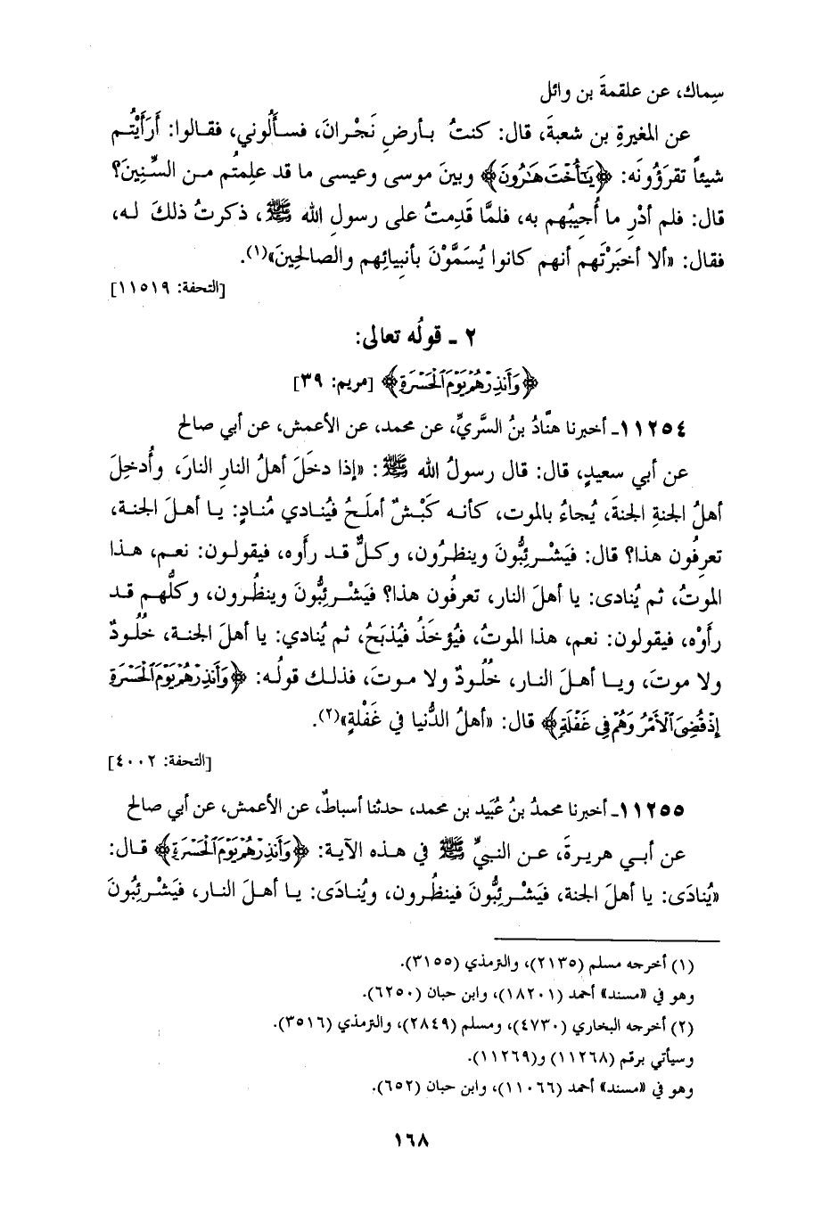 11254 - أَخْبَرَنَا هَنَّادُ بْنُ السَّرِيِّ، عَنْ مُحَمَّدٍ، عَنِ الْأَعْمَشِ، عَنْ أَبِي صَالِحٍ، عَنْ أَبِي سَعِيدٍ، قَالَ: قَالَ رَسُولُ اللهِ صَلَّى اللهُ عَلَيْهِ وَسَلَّمَ: " إِذَا §دَخَلَ أَهْلُ النَّارِ النَّارَ، وَأُدْخِلَ أَهْلُ الْجَنَّةِ الْجَنَّةَ، يُجَاءُ بِالْمَوْتِ كَأَنَّهُ كَبْشٌ أَمْلَحُ، فَيُنَادِي مُنَادٍ: يَا أَهْلَ الْجَنَّةِ، تَعْرِفُونَ هَذَا؟ قَالَ: فَيَشْرَئِبُّونَ وَيَنْظُرُونَ، وَكُلٌّ قَدْ رَأَوْهُ، فَيَقُولُونَ: نَعَمْ، هَذَا الْمَوْتُ، ثُمَّ يُنَادِي: يَا أَهْلَ النَّارِ، تَعْرِفُونَ هَذَا؟ فَيَشْرَئِبُّونَ وَيَنْظُرُونَ، وَكُلُّهُمْ قَدْ رَأَوْهُ فَيَقُولُونَ: نَعَمْ، هَذَا الْمَوْتُ، فَيُؤْخَذُ فَيُذْبَحُ، ثُمَّ يُنَادِي: يَا أَهْلَ الْجَنَّةِ، خُلُودٌ وَلَا مَوْتَ، وَيَا أَهْلَ النَّارِ، خُلُودٌ وَلَا مَوْتَ، فَذَلِكَ قَوْلُهُ: {وَأَنْذِرْهُمْ يَوْمَ الْحَسْرَةِ إِذْ قُضِيَ الْأَمْرُ وَهُمْ فِي غَفْلَةٍ} [مريم: 39] قَالَ: أَهْلُ الدُّنْيَا فِي غَفْلَةٍ "