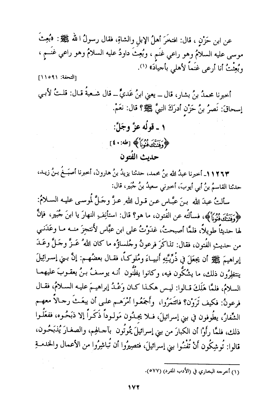11263 - أَخْبَرَنَا عَبْدُ اللهِ بْنُ مُحَمَّدٍ، حَدَّثَنَا يَزِيدُ بْنُ هَارُونَ، أَخْبَرَنَا أَصْبَغُ بْنُ زَيْدٍ، حَدَّثَنَا الْقَاسِمُ بْنُ أَبِي أَيُّوبَ، أني سَعِيدُ بْنُ جُبَيْرٍ، قَالَ: سَأَلْتُ عَبْدَ اللهِ بْنَ عَبَّاسٍ عَنْ قَوْلِ اللهِ عَزَّ وَجَلَّ لِمُوسَى عَلَيْهِ السَّلَامُ: {§وَفَتَنَّاكَ فُتُونًا} [طه: 40]، فَسَأَلْتُهُ عَنِ الْفُتُونِ مَا هُوَ؟ قَالَ: اسْتَأْنِفِ النَّهَارَ يَا ابْنَ جُبَيْرٍ، فَإِنَّ لَهَا حَدِيثًا طَوِيلًا، فَلَمَّا أَصْبَحْتُ غَدَوْتُ عَلَى ابْنِ عَبَّاسٍ لِأَنْتَجِزَ مِنْهُ مَا وَعَدَنِي مِنْ حَدِيثِ الْفُتُونِ، فَقَالَ: تَذَاكَرَ فِرْعَوْنُ وَجُلَسَاؤُهُ مَا كَانَ اللهُ عَزَّ وَجَلَّ وَعَدَ إِبْرَاهِيمَ صَلَّى اللهُ عَلَيْهِ وَسَلَّمَ أَنْ يجْعَلَ فِي ذُرِّيَّتِهِ أَنْبِيَاءَ وَمُلُوكًا، فَقَالَ بَعْضُهُمْ: إِنَّ بَنِي إِسْرَائِيلَ يَنْتَظِرُونَ ذَلِكَ مَا يَشُكُّونَ فِيهِ، وَكَانُوا يَظُنُّونَ أَنَّهُ يُوسُفُ بْنُ يَعْقُوبَ عَلَيْهِمَا السَّلَامُ، فَلَمَّا هَلَكَ قَالُوا: لَيْسَ هَكَذَا كَانَ وَعْدُ إِبْرَاهِيمَ عَلَيْهِ السَّلَامُ، فَقَالَ فِرْعَوْنُ: فَكَيْفَ تَرَوْنَ؟ فَائْتَمَرُوا وَأَجْمَعُوا أَمْرَهُمْ عَلَى أَنْ يَبْعَثَ رِجَالًا مَعَهُمُ الشِّفَارُ يَطُوفُونَ فِي بَنِي إِسْرَائِيلَ فَلَا يَجِدُونَ مَوْلُودًا ذَكَرًا إِلَّا ذَبَحُوهُ، فَفَعَلُوا ذَلِكَ، فَلَمَّا رَأَوْا أَنَّ الْكِبَارَ مِنْ بَنِي إِسْرَائِيلَ يَمُوتُونَ بِآجَالِهِمْ، وَالصَّغَارَ يُذْبَحُونَ قَالُوا: تُوشِكُونَ أَنْ تُفْنُوا بَنِي إِسْرَائِيلَ، فَتَصِيرُوا أَنْ تُبَاشِرُوا مِنَ الْأَعْمَالِ وَالْخِدْمَةِ الَّذِي كَانُوا يَكْفُونَكُمْ، فَاقْتُلُوا عَامًا كُلَّ مَوْلُودٍ ذَكَرٍ، فَيَقِلُّ نَبَاتُهُمْ، وَدَعَوْا عَامًا فَلَا تَقْتُلُوا مِنْهُمْ أَحَدًا، فَيَنْشَأُ الصِّغَارُ مَكَانَ مَنْ يَمُوتُ مِنَ الْكِبَارِ، فَإِنَّهُمْ لَنْ يَكْثُرُوا بِمَنْ تَسْتَحْيُونَ مِنْهُمْ فَتَخَافُوا مُكَاثَرَتَهُمْ إِيَّاكُمْ، وَلَنْ يَفْنَوْا بِمَنْ تَقْتُلُونَ وَتَحْتَاجُونَ إِلَيْهِمْ، فَأَجْمَعُوا أَمْرَهُمْ عَلَى ذَلِكَ، فَحَمَلَتْ أُمُّ مُوسَى بِهَارُونَ فِي الْعَامِ الَّذِي لَا يُذْبَحُ فِيهِ الْغِلْمَانُ، فَوَلَدْتُهُ عَلَانِيَةً آمِنَةً -[173]-، فَلَمَّا كَانَ مِنْ قَابِلٍ حَمَلَتْ بِمُوسَى، فَوَقَعَ فِي قَلْبِهَا الْهَمُّ وَالْحَزَنُ، وَذَلِكَ مِنَ الْفُتُونِ يَا ابْنَ جُبَيْرٍ، مَا دَخَلَ عَلَيْهِ فِي بَطْنِ أُمِّهِ مِمَّا يُرَادُ بِهِ، فَأَوْحَى اللهُ جَلَّ ذِكْرُهُ إِلَيْهَا أَنْ {لَا تَخَافِي وَلَا تَحْزَنِي إِنَّا رَادُّوهُ إِلَيْكِ وَجَاعِلُوهُ مِنَ الْمُرْسَلِينَ} [القصص: 7] فَأَمَرَهَا إِذَا وَلَدَتْ أَنْ تَجْعَلَهُ فِي تَابُوتٍ وَتُلْقِيَهُ فِي الْيَمِّ، فَلَمَّا وَلَدَتْ فَعَلَتْ ذَلِكَ، فَلَمَّا تَوَارَى عَنْهَا ابْنُهَا أَتَاهَا الشَّيْطَانُ، فَقَالَتْ فِي نَفْسِهَا: مَا فَعَلْتُ بِابْنِي، لَوْ ذُبِحَ عِنْدِي فَوَارَيْتُهُ وَكَفَّنْتُهُ كَانَ أَحَبَّ إِلَيَّ أَنْ أُلْقِيَهُ إِلَى دَوَابِّ الْبَحْرِ وَحِيْتَانِهِ، فَانْتَهَى الْمَاءُ بِهِ حَتَّى أَوْفَى بِهِ عِنْدَ فُرْضَةِ مُسْتَقَى جَوَارِي امْرَأَةِ فِرْعَوْنَ، فَلَمَّا رَأَيْنَهُ أَخَذْنَهُ فَهَمَمْنَ أَنْ يَفْتَحْنَ التَّابُوتَ، فَقَالَ بَعْضُهُنَّ: إِنَّ فِي هَذَا مَالًا، وَإِنَّا إِنْ فَتَحْنَاهُ لَمْ تُصَدِّقْنَا امْرَأَةُ الْمَلِكِ بِمَا وَجَدْنَا فِيهِ، فَحَمَلْنَهُ كَهَيْئَتِهِ لَمْ يُخْرِجْنَ مِنْهُ شَيْئًا حَتَّى دَفَعْنَهُ إِلَيْهَا، فَلَمَّا فَتَحَتْهُ رَأَتْ فِيهِ غُلَامًا، فَأُلْقِيَ عَلَيْهَا مِنْهُ مَحَبَّةٌ لَمْ يُلْقَ مِنْهَا عَلَى أَحَدٍ قَطُّ {وَأَصْبَحَ فُ