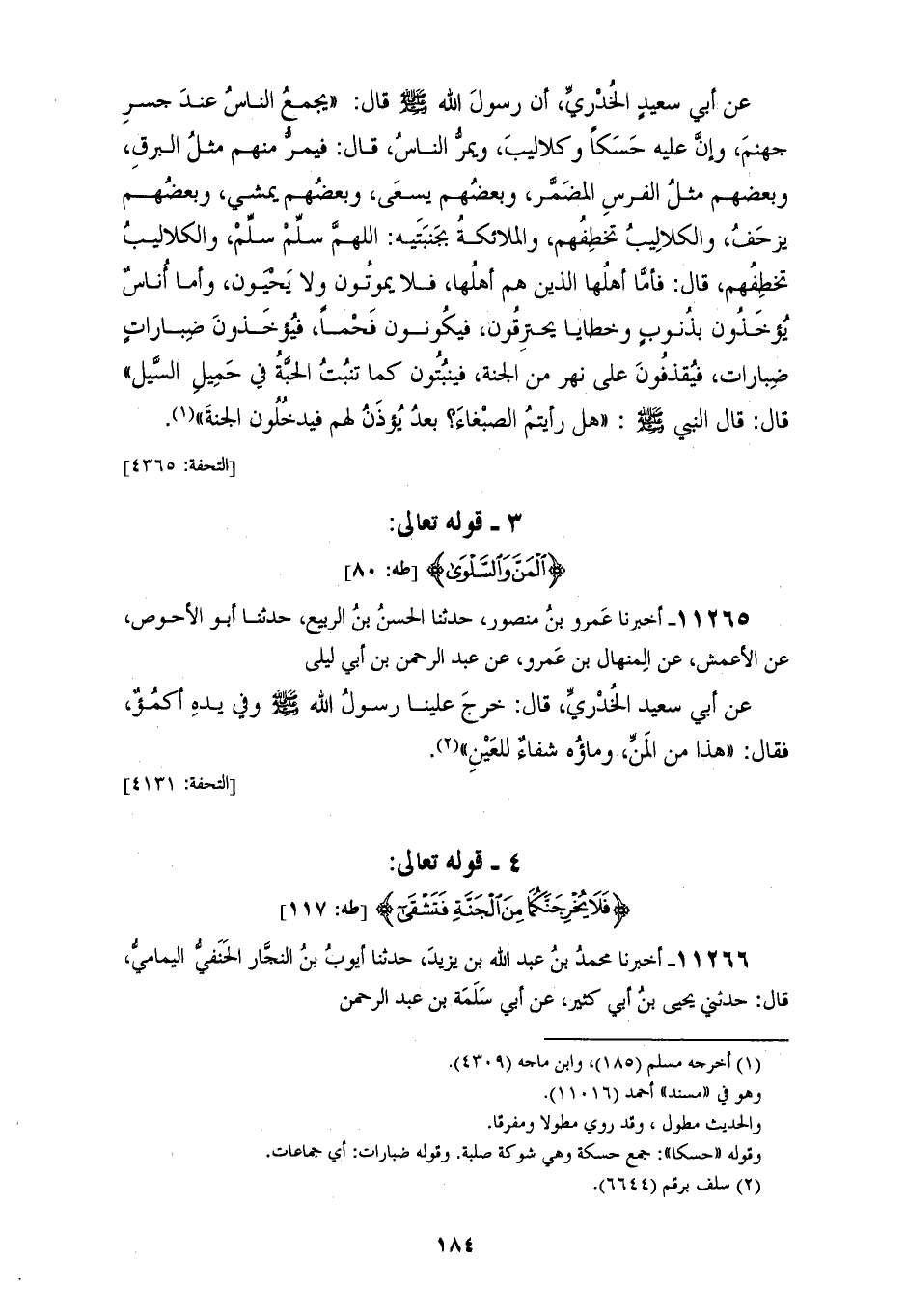 11264 - أَخْبَرَنَا مُحَمَّدُ بْنُ عَبْدِ الْأَعْلَى، حَدَّثَنَا خَالِدٌ، حَدَّثَنَا عُثْمَانُ: أَنَّ أَبَا نَضْرَةَ، حَدَّثَهُمْ، عَنْ أَبِي سَعِيدٍ الْخُدْرِيِّ: أَنَّ رَسُولَ اللهِ صَلَّى اللهُ عَلَيْهِ وَسَلَّمَ قَالَ: " §يُجْمَعُ النَّاسُ عِنْدَ جَسْرِ جَهَنَّمَ، وَإِنَّ عَلَيْهِ حَسَكًا وَكَلَالِيبَ، وَيَمُرُّ النَّاسُ، قَالَ: فَيَمُرُّ مِنْهُمْ مِثْلُ الْبَرْقِ، وَبَعْضُهُمْ مِثْلُ الْفَرَسِ الْمُضَمَّرِ، وَبَعْضُهُمْ يَسْعَى، وَبَعْضُهُمْ يَمْشِي، وَبَعْضُهُمْ يَزْحَفُ، وَالْكَلَالِيبُ تَخْطَفُهُمْ، وَالْمَلَائِكَةُ بِجَنْبَتَيْهِ: اللهُمَّ سَلِّمْ سَلِّمْ، وَالْكَلَالِيبُ تَخْطَفُهُمْ، قَالَ: فَأَمَّا أَهْلُهَا الَّذِينَ هُمْ أَهْلُهَا فَلَا يَمُوتُونَ وَلَا يَحْيَوْنَ، وَأَمَّا أُنَاسٌ يُؤْخَذُونَ بِذَنُوبٍ وَخَطَايَا يَحْتَرِقُونَ فَيَكُونُونَ فَحْمًا، فَيُؤْخَذُونَ ضِبَارَاتٍ ضِبَارَاتٍ، فَيُقْذَفُونَ عَلَى نَهْرٍ مِنَ الْجَنَّةِ، فَيَنْبُتُونَ كَمَا تَنْبُتُ الْحَبَّةُ فِي حَمِيلِ السَّيْلِ " قَالَ: قَالَ النَّبِيُّ صَلَّى اللهُ عَلَيْهِ وَسَلَّمَ: «هَلْ رَأَيْتُمُ الصَّبْغَاءَ؟ بَعْدُ يُؤْذَنُ لَهُمْ فَيَدْخُلُونَ الْجَنَّةَ»