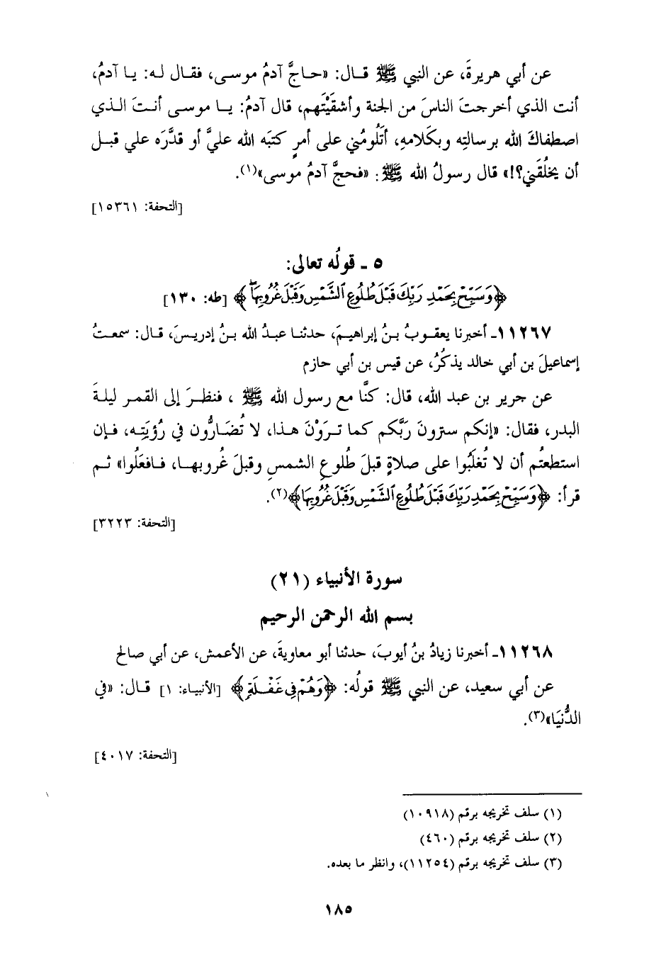11267 - أَخْبَرَنَا يَعْقُوبُ بْنُ إِبْرَاهِيمَ، حَدَّثَنَا عَبْدُ اللهِ بْنُ إِدْرِيسَ، قَالَ: سَمِعْتُ إِسْمَاعِيلَ بْنَ أَبِي خَالِدٍ يَذْكُرُ، عَنْ قَيْسِ بْنِ أَبِي حَازِمٍ، عَنْ جَرِيرِ بْنِ عَبْدِ اللهِ، قَالَ: كُنَّا مَعَ رَسُولِ اللهِ صَلَّى اللهُ عَلَيْهِ وَسَلَّمَ، فَنَظَرَ إِلَى الْقَمَرِ لَيْلَةَ الْبَدْرِ فَقَالَ: «إِنَّكُمْ §سَتَرَوْنَ رَبَّكَمْ كَمَا تَرَوْنَ هَذَا، لَا تُضَارُّونَ فِي رُؤْيَتِهِ، فَإِنِ اسْتَطَعْتُمْ أَنْ لَا تُغْلَبُوا عَلَى صَلَاةٍ قَبْلَ طُلُوعِ الشَّمْسِ وَقَبْلَ غُرُوبِهَا فَافْعَلُوا» , ثُمَّ قَرَأَ {وَسَبِّحْ بِحَمْدِ رَبِّكَ قَبْلَ طُلُوعِ الشَّمْسِ وَقَبْلَ غُرُوبِهَا} [طه: 130]