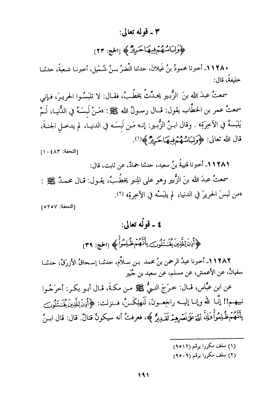 11280 - أَخْبَرَنَا مَحْمُودُ بْنُ غَيْلَانَ، حَدَّثَنَا النَّضْرُ بْنُ شُمَيْلٍ، أَخْبَرَنَا شُعْبَةُ، حَدَّثَنَا خَلِيفَةُ، قَالَ: سَمِعْتُ عَبْدَ اللهِ بْنَ الزُّبَيْرِ، يُحَدِّثُ يَخْطُبُ , فَقَالَ: لَا تَلْبَسُوا الْحَرِيرَ، فَإِنِّي سَمِعْتُ عُمَرَ بْنَ الْخَطَّابِ يَقُولُ: قَالَ رَسُولُ اللهِ صَلَّى اللهُ عَلَيْهِ وَسَلَّمَ: «§مَنْ لَبِسَهُ فِي الدُّنْيَا لَمْ يَلْبَسْهُ فِي الْآخِرَةِ» , وَقَالَ ابْنُ الزُّبَيْرِ: إِنَّهُ مَنْ لَبِسَهُ فِي الدُّنْيَا لَمْ يَدْخُلِ الْجَنَّةَ، قَالَ اللهُ تَعَالَى: {وَلِبَاسُهُمْ فِيهَا حَرِيرٌ} [الحج: 23]