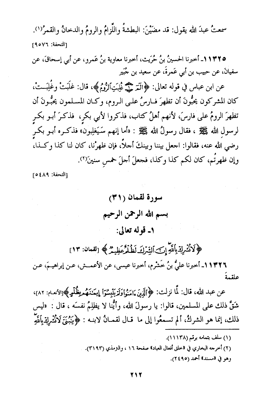 11326 - أَخْبَرَنَا عَلِيُّ بْنُ خَشْرَمٍ، أَخْبَرَنَا عِيسَى، عَنِ الْأَعْمَشِ، عَنْ إِبْرَاهِيمَ، عَنْ عَلْقَمَةَ، عَنْ عَبْدِ اللهِ، قَالَ: لَمَّا نَزَلَتِ {الَّذِينَ آمَنُوا وَلَمْ يَلْبِسُوا} [الأنعام: 82] إِيمَانَهُمْ بِظُلْمٍ , شَقَّ ذَلِكَ عَلَى الْمُسْلِمِينَ، قَالُوا: يَا رَسُولَ اللهِ، وَأَيُّنَا لَا يَظْلِمُ نَفْسَهُ؟ , قَالَ: " لَيْسَ ذَلِكَ، إِنَّمَا §هُوَ الشِّرْكُ، أَلَمْ تَسْمَعُوا إِلَى مَا قَالَ لُقْمَانُ لِابْنِهِ {يَا بُنَيَّ لَا تُشْرِكْ بِاللهِ إِنَّ الشِّرْكَ لَظُلْمٌ عَظِيمٌ} [لقمان: 13]