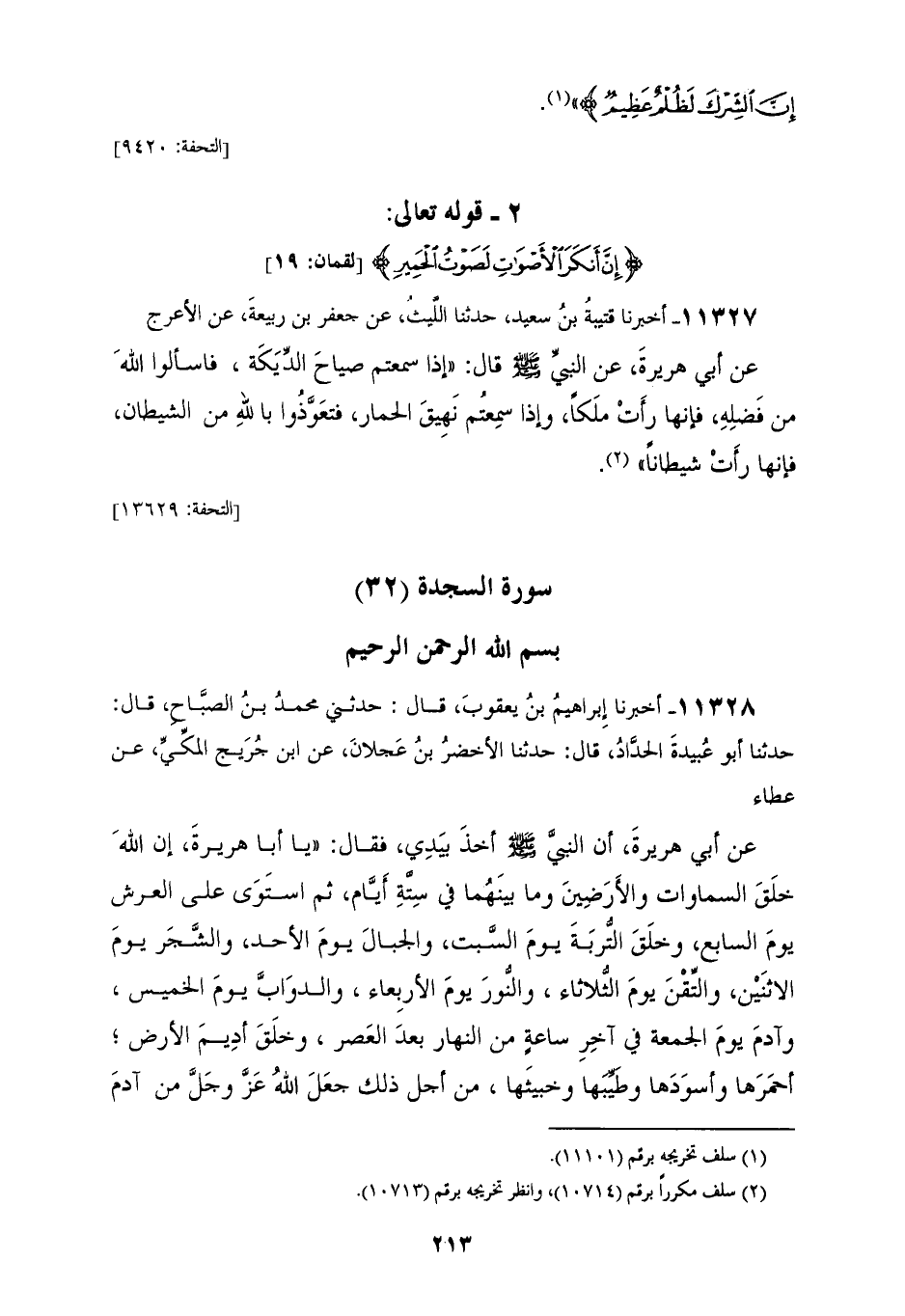 11327 - أَخْبَرَنَا قُتَيْبَةُ بْنُ سَعِيدٍ، حَدَّثَنَا اللَّيْثُ، عَنْ جَعْفَرِ بْنِ رَبِيعَةَ، عَنِ الْأَعْرَجِ، عَنْ أَبِي هُرَيْرَةَ، عَنِ النَّبِيِّ صَلَّى اللهُ عَلَيْهِ وَسَلَّمَ قَالَ: «§إِذَا سَمِعْتُمْ صِيَاحَ الدِّيَكَةِ فَاسْأَلُوا اللهَ مِنْ فَضْلِهِ، فَإِنَّهَا رَأَتْ مَلَكًا، وَإِذَا سَمِعْتُمْ نَهِيقَ الْحِمَارِ فَتَعَوَّذُوا بِاللهِ مِنَ الشَّيْطَانِ، فَإِنَّهَا رَأَتْ شَيْطَانًا»