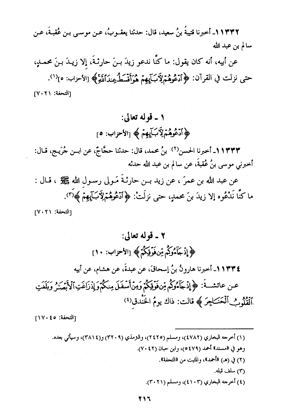 11333 - أَخْبَرَنَا الْحَسَنُ بْنُ مُحَمَّدٍ، قَالَ: حَدَّثَنَا حَجَّاجٌ، عَنِ ابْنِ جُرَيْجٍ، قَالَ: أَخْبَرَنِي مُوسَى بْنُ عُقْبَةَ، عَنْ سَالِمَ بْنَ عَبْدِ اللهِ، حَدَّثَهُ، عَنْ عَبْدِ اللهِ بْنِ عُمَرَ، عَنْ زَيْدِ بْنِ حَارِثَةَ، مَوْلَى رَسُولِ اللهِ صَلَّى اللهُ عَلَيْهِ وَسَلَّمَ قَالَ: " مَا كُنَّا نَدْعُوهُ إِلَّا زَيْدَ بْنَ مُحَمَّدٍ حَتَّى نَزَلَتِ {§ادْعُوهُمْ لِآبَائِهِمْ} [الأحزاب: 5]