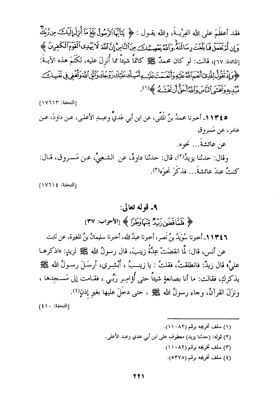 11346 - أَخْبَرَنَا سُوَيْدُ بْنُ نَصْرٍ، أَخْبَرَنَا عَبْدُ اللهِ، أَخْبَرَنَا سُلَيْمَانُ بْنُ الْمُغِيرَةِ، عَنْ ثَابِتٍ، عَنْ أَنَسٍ، قَالَ: لَمَّا انْقَضَتْ عِدَّةُ زَيْنَبَ , قَالَ رَسُولُ اللهِ صَلَّى اللهُ عَلَيْهِ وَسَلَّمَ لِزَيْدٍ: «§اذْكُرْهَا عَلَيَّ» , قَالَ زَيْدٌ: فَانْطَلَقْتُ فَقُلْتُ: يَا زَيْنَبُ أَبْشِرِي، أَرْسَلَ رَسُولُ اللهِ صَلَّى اللهُ عَلَيْهِ وَسَلَّمَ يَذْكُرُكِ، فَقَالَتْ: مَا أَنَا بِصَانِعَةٍ شَيْئًا حَتَّى أُؤَامِرَ رَبِّي، فَقَامَتْ إِلَى مَسْجِدِهَا وَنَزَلَ الْقُرْآنُ، وَجَاءَ رَسُولُ اللهِ صَلَّى اللهُ عَلَيْهِ وَسَلَّمَ حَتَّى دَخَلَ عَلَيْهَا بِغَيْرِ إِذْنٍ