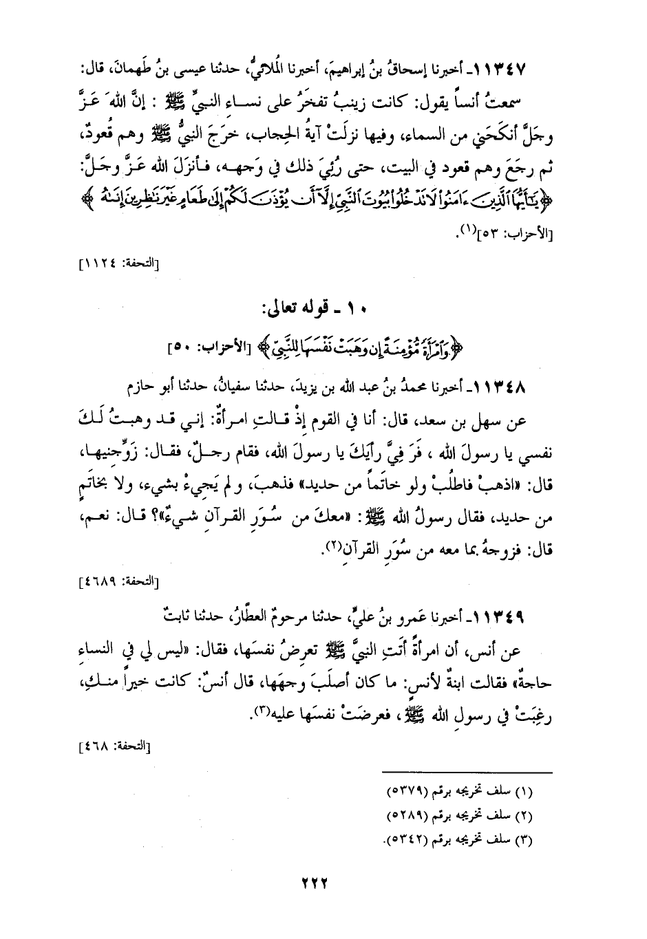 11347 - أَخْبَرَنَا إِسْحَاقُ بْنُ إِبْرَاهِيمَ، أَخْبَرَنَا الْمُلَائِيُّ، حَدَّثَنَا عِيسَى بْنُ طَهْمَانَ، قَالَ: سَمِعْتُ أَنَسًا، يَقُولُ: كَانَتْ زَيْنَبُ تَفْخَرُ عَلَى نِسَاءِ النَّبِيِّ صَلَّى اللهُ عَلَيْهِ وَسَلَّمَ: «إِنَّ اللهَ عَزَّ وَجَلَّ أَنْكَحَنِي مِنَ السَّمَاءِ»، وَفِيهَا نَزَلَتْ آيَةُ الْحِجَابِ، خَرَجَ النَّبِيُّ صَلَّى اللهُ عَلَيْهِ وَسَلَّمَ وَهُمْ قُعُودٌ، ثُمَّ رَجَعَ وَهُمْ قَعُودٌ فِي الْبَيْتِ، حَتَّى رُئِيَ ذَلِكَ فِي وَجْهِهِ، فَأَنْزَلَ اللهُ عَزَّ وَجَلَّ {§يَا أَيُّهَا الَّذِينَ آمَنُوا لَا تَدْخُلُوا بُيُوتَ النَّبِيِّ إِلَّا أَنْ يُؤْذَنَ لَكُمْ إِلَى طَعَامٍ غَيْرَ نَاظِرِينَ إِنَاهُ} [الأحزاب: 53]