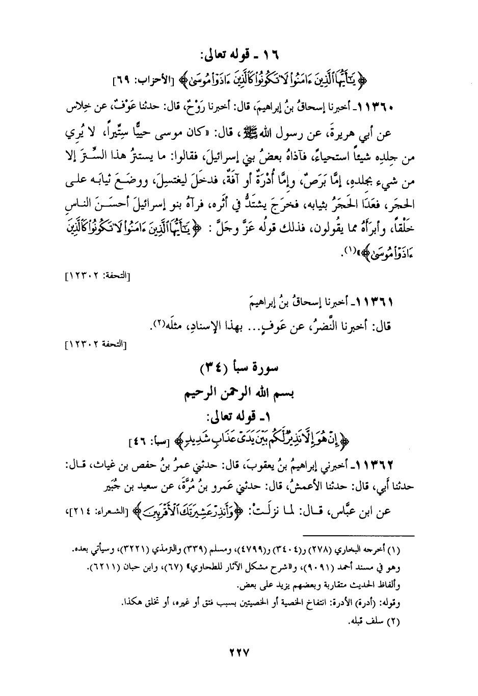 11360 - أَخْبَرَنَا إِسْحَاقُ بْنُ إِبْرَاهِيمَ، قَالَ: أَخْبَرَنَا رَوْحٌ، قَالَ: حَدَّثَنَا عَوْفٌ، عَنْ خِلَاسٍ، عَنْ أَبِي هُرَيْرَةَ، عَنْ رَسُولِ اللهِ صَلَّى اللهُ عَلَيْهِ وَسَلَّمَ قَالَ: " كَانَ مُوسَى حَيِيًّا سِتِّيرًا، لَا يُرِي مِنْ جِلْدِهِ شَيْئًا اسْتِحْيَاءً، فَآذَاهُ بَعْضُ بَنِي إِسْرَائِيلَ , فَقَالُوا: مَا يَسْتَتِرُ هَذَا السِّتْرَ إِلَّا مِنْ شَيْءٍ بِجِلْدِهِ، إِمَّا بَرَصٌ وَإِمَّا أُدْرَةٌ، أَوْ آفَةٌ، فَدَخَلَ لِيَغْتَسِلَ , وَوَضَعَ ثِيَابَهُ عَلَى الْحَجَرِ، فَعَدَا الْحَجَرُ بِثِيَابِهِ، فَخَرَجَ يَشْتَدُّ فِي أَثَرِهِ، فَرَآهُ بَنُو إِسْرَائِيلَ أَحْسَنَ النَّاسِ خَلْقًا، وَأَبْرَأَهُ مِمَّا يَقُولُونَ، فَذَلِكَ قَوْلُهُ عَزَّ وَجَلَّ {§يَا أَيُّهَا الَّذِينَ آمَنُوا لَا تَكُونُوا كَالَّذِينَ آذَوْا مُوسَى} [الأحزاب: 69] ,