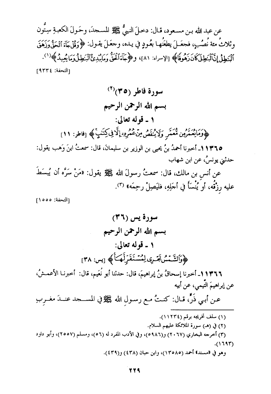11366 - أَخْبَرَنَا إِسْحَاقُ بْنُ إِبْرَاهِيمَ، قَالَ: حَدَّثَنَا أَبُو نُعَيْمٍ، قَالَ: أَخْبَرَنَا الْأَعْمَشُ، عَنْ إِبْرَاهِيمَ التَّيْمِيِّ، عَنْ أَبِيهِ، عَنْ أَبِي ذَرٍّ، قَالَ: كُنْتُ مَعَ رَسُولِ اللهِ صَلَّى اللهُ عَلَيْهِ وَسَلَّمَ فِي الْمَسْجِدِ عِنْدَ مَغْرِبِ الشَّمْسِ , فَقَالَ: «أَتَدْرُونَ أَيْنَ تَغْرُبُ الشَّمْسُ؟» , قُلْتُ: اللهُ وَرَسُولُهُ أَعْلَمُ، قَالَ: " تَذْهَبُ حَتَّى تَنْتَهِيَ تَحْتَ الْعَرْشِ عِنْدَ رَبِّهَا، ثُمَّ تَسْتَأْذِنُ فَيُؤْذَنُ لَهَا، وَيُوشِكُ أَنْ تَسْتَأْذِنَ فَلَا يُؤْذَنَ لَهَا، وَتَسْتَشْفِعُ وَتَطْلُبُ، فَإِذَا قَالَ ذَلِكَ , قِيلَ: اطْلُعِي مِنْ مَكَانِكِ، فَذَلِكَ قَوْلُهُ: {§وَالشَّمْسُ تَجْرِي لِمُسْتَقَرٍّ لَهَا} [يس: 38]