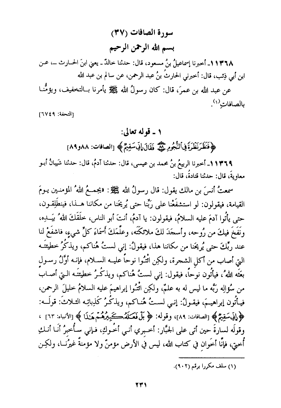 11368 - أَخْبَرَنَا إِسْمَاعِيلُ بْنُ مَسْعُودٍ، قَالَ: حَدَّثَنَا خَالِدٌ يَعْنِي ابْنَ الْحَارِثِ، عَنِ ابْنِ أَبِي ذِئْبٍ، قَالَ: أَخْبَرَنِي الْحَارِثُ بْنُ عَبْدِ الرَّحْمَنِ، عَنْ سَالِمِ بْنِ عَبْدِ اللهِ، عَنْ عَبْدِ اللهِ بْنِ عُمَرَ، قَالَ: «كَانَ رَسُولُ اللهِ صَلَّى اللهُ عَلَيْهِ وَسَلَّمَ §يَأْمُرُنَا بِالتَّخْفِيفِ وَيَؤُمُّنَا بِالصَّافَّاتِ»