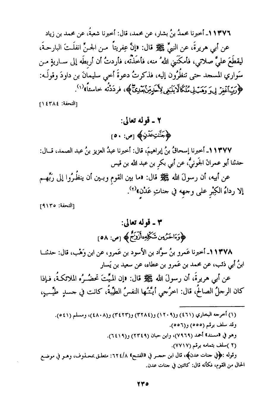 11376 - أَخْبَرَنَا مُحَمَّدُ بْنُ بَشَّارٍ، عَنْ مُحَمَّدٍ، قَالَ: أَخْبَرَنَا شُعْبَةُ، عَنْ مُحَمَّدِ بْنِ زِيَادٍ، عَنْ أَبِي هُرَيْرَةَ، عَنِ النَّبِيِّ صَلَّى اللهُ عَلَيْهِ وَسَلَّمَ قَالَ: " إِنَّ §عِفْرِيتًا مِنَ الْجِنِّ انْفَلَتَ الْبَارِحَةَ لِيَقْطَعَ عَلَيَّ صَلَاتِي، فَأَمْكَنَنِي اللهُ مِنْهُ، فَأَخَذْتُهُ فَأَرَدْتُ أَنْ أَرْبِطَهُ إِلَى سَارِيَةٍ مِنْ سَوَارِي الْمَسْجِدِ حَتَّى تَنْظُرُونَ إِلَيْهِ، فَذَكَرْتُ دَعْوَةَ أَخِي سُلَيْمَانَ بْنِ دَاوُدَ، وَقَوْلَهُ: {رَبِّ اغْفِرْ لِي وَهَبْ لِي مُلْكًا لَا يَنْبَغِي لِأَحَدٍ مِنْ بَعْدِي} [ص: 35] , فَرَدَدْتُهُ خَاسِئًا "