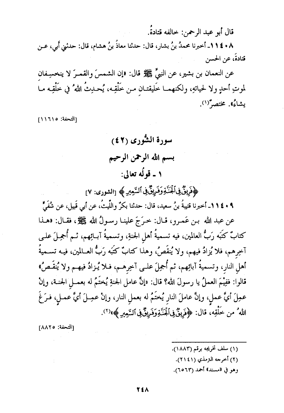 11409 - أَخْبَرَنَا قُتَيْبَةُ بْنُ سَعِيدٍ، قَالَ: حَدَّثَنَا بَكْرٌ، وَاللَّيْثُ، عَنْ أَبِي قَبِيلٍ، عَنْ شُفَيٍّ، عَنْ عَبْدِ اللهِ بْنِ عَمْرٍو، قَالَ: خَرَجَ عَلَيْنَا رَسُولُ اللهِ صَلَّى اللهُ عَلَيْهِ وَسَلَّمَ فَقَالَ: «هَذَا كِتَابٌ كَتَبَهُ رَبُّ الْعَالَمِينَ، فِيهِ تَسْمِيَةُ أَهْلِ الْجَنَّةِ وَتَسْمِيَةُ آبَائِهِمْ، ثُمَّ أُجْمِلَ عَلَى آخِرِهِمْ، فَلَا يُزَادُ فِيهِمْ وَلَا يُنْقَصُ، وَهَذَا كِتَابٌ كَتَبَهُ رَبُّ الْعَالَمِينَ، فِيهِ تَسْمِيَةُ أَهْلِ النَّارِ وَتَسْمِيَةُ آبَائِهِمْ، ثُمَّ أُجْمِلَ عَلَى آخِرِهِمْ، فَلَا يُزَادُ فِيهِمْ وَلَا يُنْقَصُ» , قَالُوا: فَفِيمَ الْعَمَلُ يَا رَسُولَ اللهِ؟ , قَالَ: " إِنَّ §عَامِلَ الْجَنَّةِ يُخْتَمُ لَهُ بِعَمَلِ الْجَنَّةِ، وَإِنْ عَمِلَ أَيَّ عَمَلٍ، وَإِنَّ عَامِلَ النَّارِ يُخْتَمُ لَهُ بِعَمَلِ النَّارِ، وَإِنَّ عَمِلَ أَيَّ عَمَلٍ، فَرَغَ اللهُ مِنْ خَلْقِهِ , قَالَ: {فَرِيقٌ فِي الْجَنَّةِ وَفَرِيقٌ فِي السَّعِيرِ} [الشورى: 7]