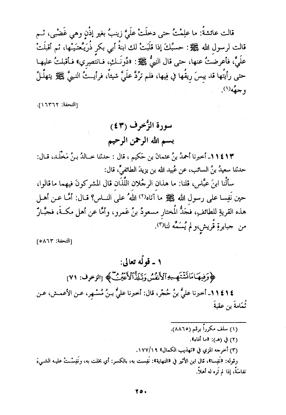 11413 - أَخْبَرَنَا أَحْمَدُ بْنُ عُثْمَانَ بْنِ حَكِيمٍ، قَالَ: حَدَّثَنَا خَالِدُ بْنُ مَخْلَدٍ، قَالَ: حَدَّثَنَا سَعِيدُ بْنُ السَّائِبِ، عَنْ عُبَيْدِ اللهِ بْنِ يَزِيدَ الطَّائِفِيِّ، قَالَ: سَأَلْنَا ابْنُ عَبَّاسٍ , قُلْنَا: مَا هَذَانِ الرَّجُلَانِ اللَّذَانِ قَالَ الْمُشْرِكُونَ فِيهِمَا مَا قَالُوا حِينَ نَفِسَا عَلَى رَسُولِ اللهِ صَلَّى اللهُ عَلَيْهِ وَسَلَّمَ , مَا آتَاهُ اللهُ عَلَى النَّاسِ؟ , قَالَ: " أَمَّا §عَنْ أَهْلِ هَذِهِ الْقَرْيَةِ لِلْطَائِفِ فَجَدُّ الْمُخْتَارِ: مَسْعُودُ بْنُ عَمْرٍو، وَأَمَّا عَنْ أَهْلِ مَكَّةَ فَجَبَّارٌ مِنْ جَبَابِرَةِ قُرَيْشٍ، وَلَمْ يُسَمِّهِ لَنَا "