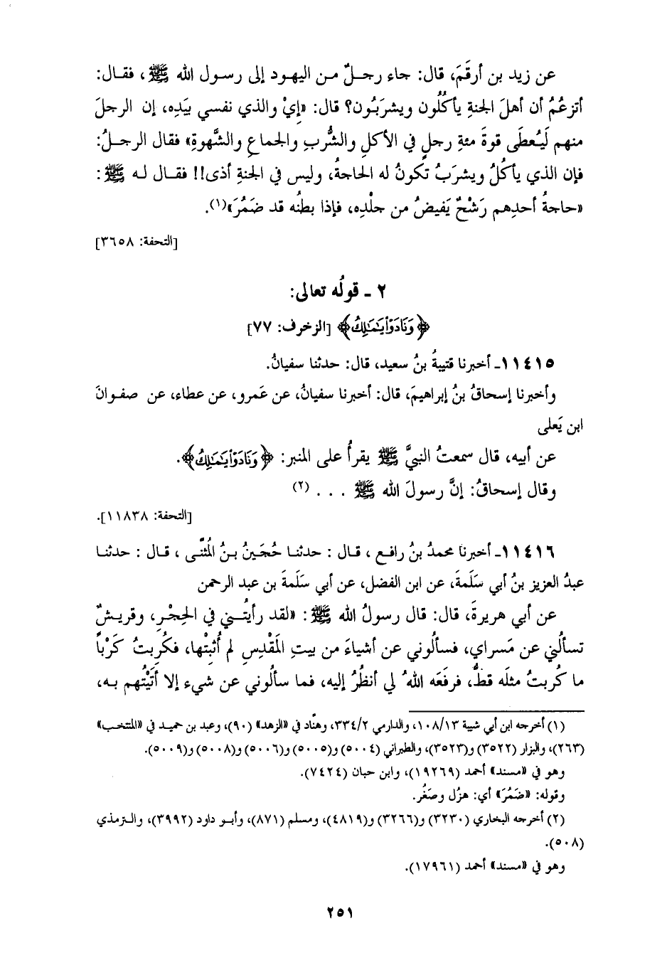 11415 - أَخْبَرَنَا قُتَيْبَةُ بْنُ سَعِيدٍ، قَالَ: حَدَّثَنَا سُفْيَانُ، وَأَخْبَرَنَا إِسْحَاقُ بْنُ إِبْرَاهِيمَ، قَالَ: أَخْبَرَنَا سُفْيَانُ، عَنْ عَمْرٍو، عَنْ عَطَاءٍ، عَنْ صَفْوَانَ بْنِ يَعْلَى، عَنْ أَبِيهِ، قَالَ: سَمِعْتُ النَّبِيَّ صَلَّى اللهُ عَلَيْهِ وَسَلَّمَ يَقْرَأُ عَلَى الْمِنْبَرِ {§وَنَادَوْا يَا مَالِكُ} [الزخرف: 77]. وَقَالَ إِسْحَاقُ:. . . إِنَّ رَسُولَ اللهِ صَلَّى اللهُ عَلَيْهِ وَسَلَّمَ. . . . . .