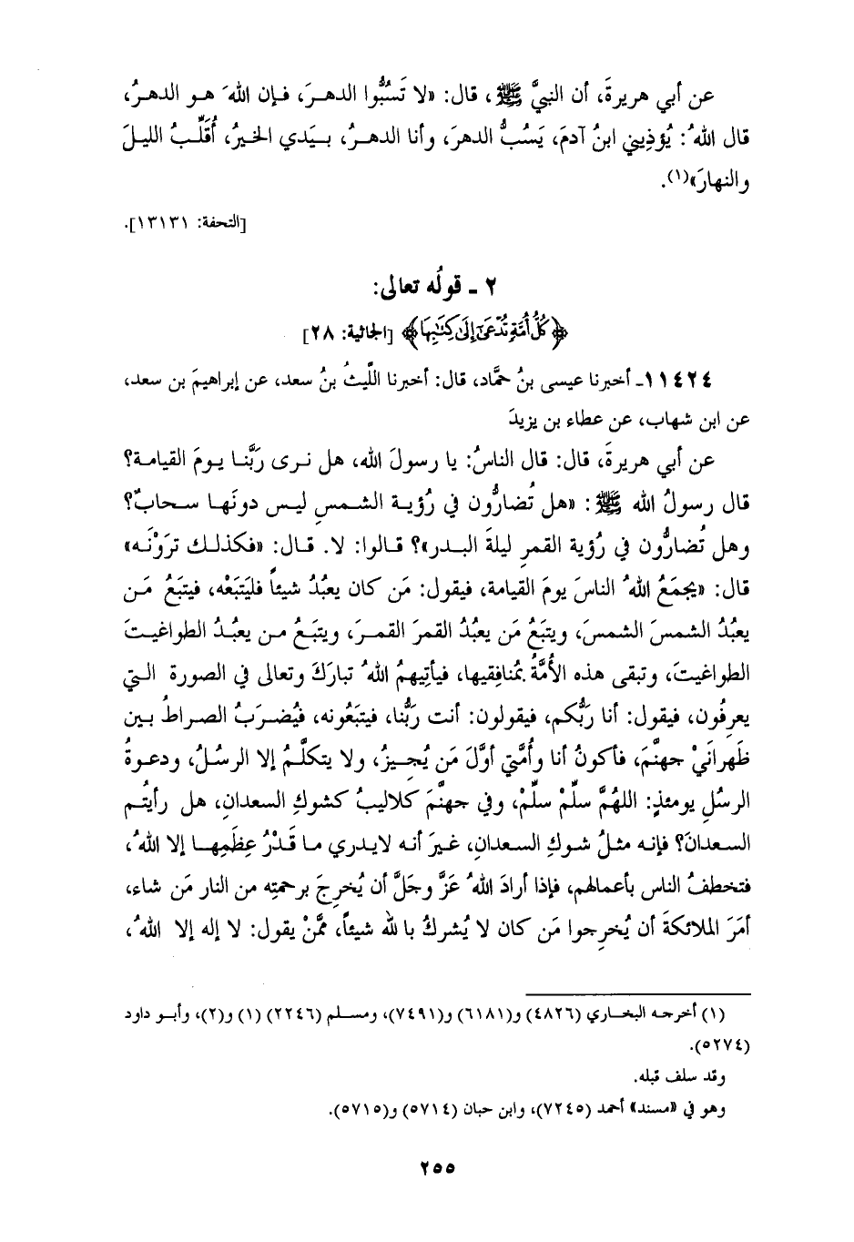 11424 - أَخْبَرَنَا عِيسَى بْنُ حَمَّادٍ، قَالَ: أَخْبَرَنَا اللَّيْثُ بْنُ سَعْدٍ، عَنْ إِبْرَاهِيمَ بْنِ سَعْدٍ، عَنِ ابْنِ شِهَابٍ، عَنْ عَطَاءِ بْنِ يَزِيدَ، عَنْ أَبِي هُرَيْرَةَ، قَالَ: قَالَ النَّاسُ: يَا رَسُولَ اللهِ، هَلْ نَرَى رَبَّنَا يَوْمَ الْقِيَامَةِ؟ , قَالَ رَسُولُ اللهِ صَلَّى اللهُ عَلَيْهِ وَسَلَّمَ: «هَلْ تُضَارُّونَ فِي رُؤْيَةِ الشَّمْسِ لَيْسَ دُونَهَا سَحَابٌ , وَهَلْ تُضَارُّونَ فِي رُؤْيَةِ الْقَمَرِ لَيْلَةَ الْبَدْرِ؟» , قَالُوا: لَا، قَالَ: «فَكَذَلِكَ تَرَوْنَهُ» , قَالَ: " §يَجْمَعُ اللهُ النَّاسَ يَوْمَ الْقِيَامَةِ , فَيَقُولُ: مَنْ كَانَ يَعْبُدُ شَيْئًا فَلْيَتْبَعْهُ، فَيَتْبَعُ مَنْ يَعْبُدُ الشَّمْسَ الشَّمْسَ، وَيَتْبَعُ مَنْ يَعْبُدُ الْقَمَرَ الْقَمَرَ، وَيَتْبَعُ مَنْ يَعْبُدُ الطَّوَاغِيتَ الطَّوَاغِيتَ، وَتَبْقَى هَذِهِ الْأُمَّةُ بِمُنَافِقِيهَا، فَيَأْتِيهِمُ اللهُ تَبَارَكَ وَتَعَالَى فِي الصُّورَةِ الَّتِي يَعْرِفُونَ , فَيَقُولُ: أَنَا رَبُّكُمْ، فَيَقُولُونَ: أَنْتَ رَبُّنَا فَيَتْبَعُونَهُ، فَيُضْرَبُ الصِّرَاطُ بَيْنَ ظَهْرَانَيْ جَهَنَّمَ، فَأَكُونُ أَنَا وَأُمَّتِي أَوَّلَ مَنْ يُجِيزُ، وَلَا يَتَكَلَّمُ إِلَّا الرُّسُلُ، وَدَعْوَةُ الرُّسُلِ يَوْمَئِذٍ: اللهُمَّ سَلَّمْ سَلِّمْ، وَفِي جَهَنَّمَ كَلَالِيبُ كَشَوْكِ السَّعْدَانِ، هَلْ رَأَيْتُمُ السَّعْدَانَ؟ , فَإِنَّهُ مِثْلُ شَوْكِ السَّعْدَانِ , غَيْرَ أَنَّهُ لَا يَدْرِي مَا قَدْرُ عِظَمِهَا إِلَّا اللهُ، فَتَخْطَفُ النَّاسَ بِأَعْمَالِهِمْ، فَإِذَا أَرَادَ اللهُ عَزَّ وَجَلَّ أَنْ يُخْرِجَ بِرَحْمَتِهِ مِنَ النَّارِ مَنْ شَاءَ، أَمَرَ الْمَلَائِكَةَ أَنْ يُخْرِجُوا مَنْ كَانَ لَا يُشْرِكُ بِاللهِ شَيْئًا , مِمَّنْ يَقُولُ: لَا إِلَهَ إِلَّا اللهُ، مِمَّنْ أَرَادَ اللهُ تَبَارَكَ وَتَعَالَى أَنْ يَرْحَمَهُ، فَيَعْرِفُونَهُمْ فِي النَّارِ بِآثَارِ السُّجُودِ، فَيُخْرِجُونَهُمْ بِآثَارِ السُّجُودِ، حَرَّمَ اللهُ تَبَارَكَ وَتَعَالَى النَّارَ عَلَى ابْنِ آدَمَ أَنْ تَأْكُلَ أَثَرَ السُّجُودِ، فَيُخْرِجُونَهُمْ مِنَ النَّارِ وَقَدِ امْتَحَشُوا، فَيُصَبُّ عَلَيْهِمْ مَاءُ الْحَيَاةِ , فَيَنْبُتُونَ كَمَا تَنْبُتُ الْحَبَّةُ فِي حَمِيلِ السَّيْلِ " مُخْتَصَرٌ