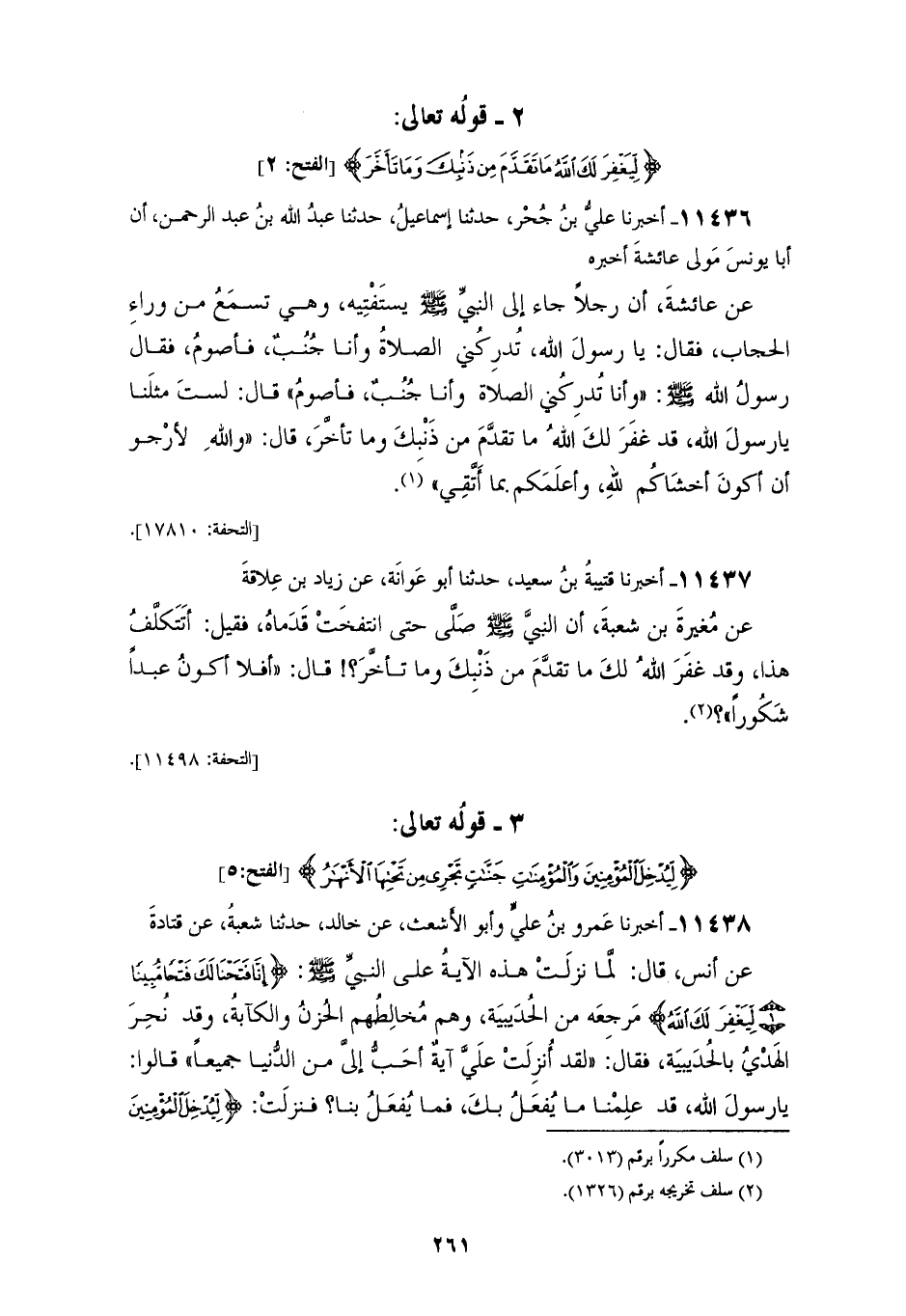 11438 - أَخْبَرَنَا عَمْرُو بْنُ عَلِيٍّ، وَأَبُو الْأَشْعَثِ، عَنْ خَالِدٍ، حَدَّثَنَا شُعْبَةُ، عَنْ قَتَادَةَ، عَنْ أَنَسٍ، قَالَ: لَمَّا نَزَلَتْ هَذِهِ الْآيَةُ عَلَى النَّبِيِّ صَلَّى اللهُ عَلَيْهِ وَسَلَّمَ {§إِنَّا فَتَحْنَا لَكَ فَتْحًا مُبِينًا لِيَغْفِرَ لَكَ اللهُ} [الفتح: 2] مَرْجِعَهُ مِنَ الْحُدَيْبِيَةِ وَهُمْ مُخَالِطُهُمُ الْحُزْنُ وَالْكَآبَةُ، وَقَدْ نُحِرَ الْهَدْيُ بِالْحُدَيْبِيَةِ , فَقَالَ: «لَقَدْ أُنْزِلَتْ عَلَيَّ آيَةٌ أَحَبُّ إِلَيَّ مِنَ الدُّنْيَا جَمِيعًا» , قَالُوا: يَا رَسُولَ اللهِ، قَدْ عَلِمْنَا مَا يَفْعَلُ بِكَ، فَمَا يَفْعَلُ بِنَا؟ , فَنَزَلَتْ {لَيُدْخِلَ الْمُؤْمِنِينَ وَالْمُؤْمِنَاتِ جَنَّاتٍ تَجْرِي مِنْ تَحْتَهَا الْأَنْهَارُ} [الفتح: 5] إِلَى قَوْلِهِ {فَوْزًا عَظِيمًا} [النساء: 73] , اللَّفْظُ لِعَمْرٍو
