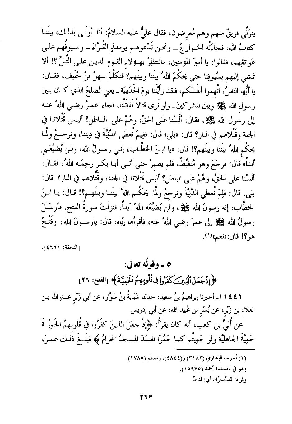11441 - أَخْبَرَنَا إِبْرَاهِيمُ بْنُ سَعِيدٍ، حَدَّثَنَا شَبَابَةُ بْنُ سَوَّارٍ، عَنْ أَبِي زَبْرٍ عَبْدِ اللهِ بْنِ الْعَلَاءِ بْنِ زَبْرٍ، عَنْ بُسْرِ بْنِ عُبَيْدِ اللهِ، عَنْ أَبِي إِدْرِيسَ، عَنْ أُبَيِّ بْنِ كَعْبٍ، أَنَّهُ كَانَ يَقْرَأُ: {§إِذْ جَعَلَ الَّذِينَ كَفَرُوا فِي قُلُوبِهِمُ الْحَمِيَّةَ حَمِيَّةَ الْجَاهِلِيَّةِ} [الفتح: 26] , وَلَوْ حُمِيتُمْ كَمَا حَمَوْا لَفَسَدَ الْمَسْجِدُ الْحَرَامُ، فَبَلَغَ ذَلِكَ عُمَرَ فَأَغْلَظَ لَهُ، قَالَ: إِنَّكَ لَتَعْلَمُ أَنِّي كُنْتُ أَدْخُلُ عَلَى رَسُولِ اللهِ صَلَّى اللهُ عَلَيْهِ وَسَلَّمَ , فَيُعَلُّمُنِي مِمَّا عَلَّمَهُ اللهُ، فَقَالَ عُمَرُ: بَلْ أَنْتَ رَجُلٌ عِنْدَكَ عِلْمٌ وَقُرْآنٌ، فَاقْرَأْ وَعَلِّمْ مِمَّا عَلَّمَكَ اللهُ وَرَسُولُهُ