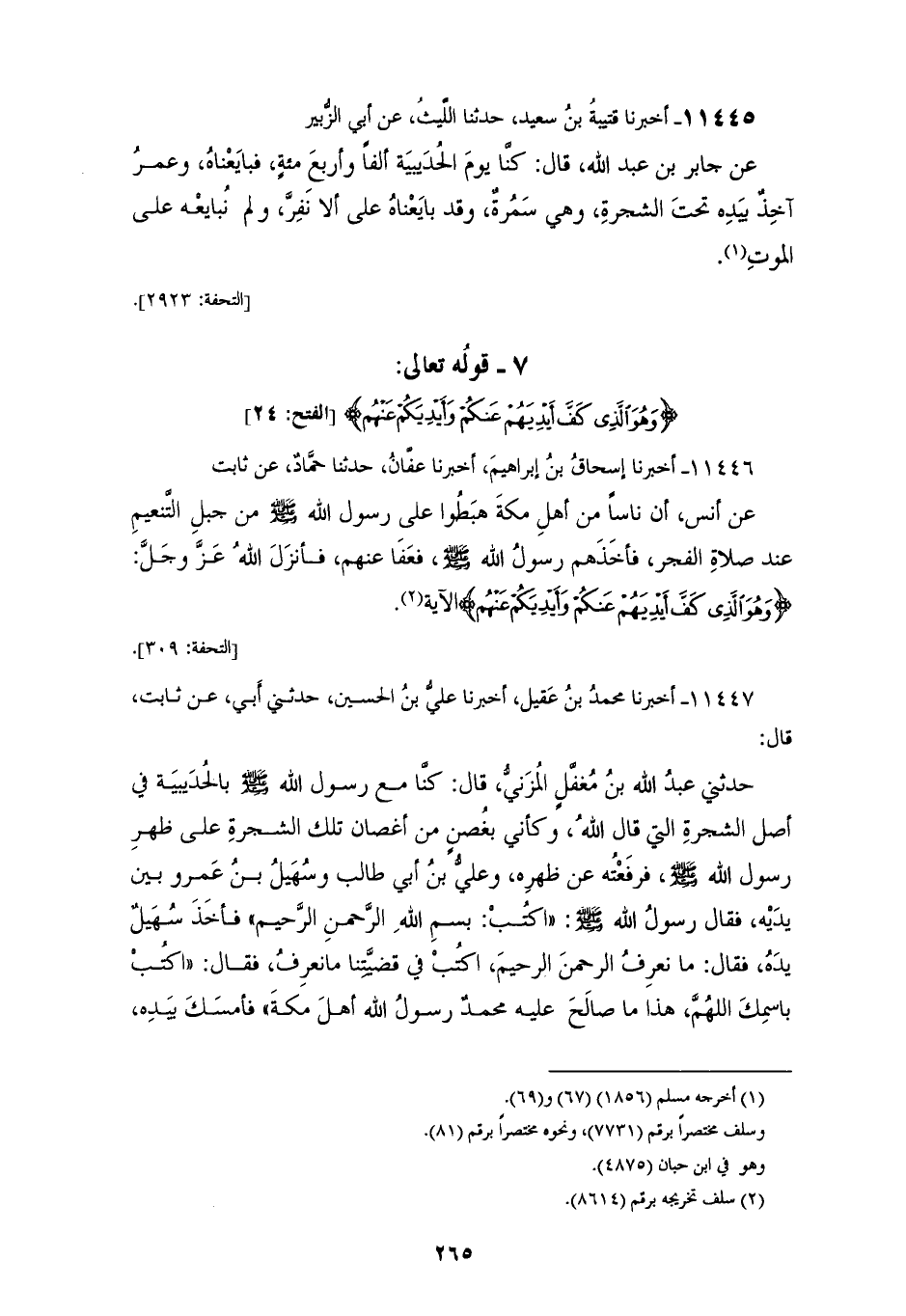 11447 - أَخْبَرَنَا مُحَمَّدُ بْنُ عُقَيْلٍ، أَخْبَرَنَا عَلِيُّ بْنُ الْحُسَيْنِ، حَدَّثَنِي أَبِي، عَنْ ثَابِتٍ، قَالَ: حَدَّثَنِي عَبْدُ اللهِ بْنُ مُغَفَّلٍ الْمُزَنِيُّ، قَالَ: كُنَّا مَعَ رَسُولِ اللهِ صَلَّى اللهُ عَلَيْهِ وَسَلَّمَ بِالْحُدَيْبِيَةِ فِي أَصْلِ الشَّجَرَةِ الَّتِي قَالَ اللهُ، وَكَأَنِّي بِغُصْنٍ مِنْ أَغْصَانِ تِلْكَ الشَّجَرَةِ عَلَى ظَهْرِ رَسُولِ اللهِ صَلَّى اللهُ عَلَيْهِ وَسَلَّمَ، فَرَفَعْتُهُ عَنْ ظَهْرِهِ، وَعَلِيُّ بْنُ أَبِي طَالِبٍ وَسُهَيْلُ بْنُ عَمْرٍو بَيْنَ يَدَيْهِ، فَقَالَ رَسُولُ اللهِ صَلَّى اللهُ عَلَيْهِ وَسَلَّمَ: " اكْتُبْ: بِسْمِ اللهِ الرَّحْمَنِ الرَّحِيمِ " فَأَخَذَ سُهَيْلٌ يَدَهُ، فَقَالَ: مَا نَعْرِفُ الرَّحْمَنَ الرَّحِيمَ، اكْتُبْ فِي قَضِيَّتِنَا مَا نَعْرِفُ، فَقَالَ: «اكْتُبْ بِاسْمِكَ اللهُمَّ»، هَذَا مَا صَالِحَ عَلَيْهِ مُحَمَّدٌ رَسُولُ اللهِ أَهْلَ مَكَّةَ , فَأَمْسَكَ بِيَدِهِ فَقَالَ: فَقَدْ ظَلَمْنَاكَ إِنْ كُنْتَ رَسُولًا، اكْتُبْ فِي قَضِيَّتِنَا مَا نَعْرِفُ، فَقَالَ: " اكْتُبْ: هَذَا مَا صَالِحَ عَلَيْهِ مُحَمَّدُ بْنُ عَبْدِ اللهِ بْنِ عَبْدِ الْمُطَّلِبِ، وَأَنَا رَسُولُ اللهِ " , قَالَ: فَكَتَبَ، فَبَيْنَمَا نَحْنُ كَذَلِكَ إِذْ خَرَجَ عَلَيْنَا ثَلَاثُونَ شَابًّا عَلَيْهِمُ السِّلَاحُ، فَثَارُوا فِي وُجُوهِنَا، فَدَعَا عَلَيْهِمُ النَّبِيُّ صَلَّى اللهُ عَلَيْهِ وَسَلَّمَ، فَأَخَذَ اللهُ بِأَبْصَارِهِمْ، فَقُمْنَا إِلَيْهِمْ فَأَخَذْنَاهُمْ، فَقَالَ لَهُمْ رَسُولُ اللهِ صَلَّى اللهُ عَلَيْهِ وَسَلَّمَ: «هَلْ جِئْتُمْ فِي عَهْدِ أَحَدٍ، أَوْ هَلْ جَعَلَ لَكُمْ أَحَدٌ أَمَانًا؟ ,» فَقَالُوا: لَا، فَخَلَّى سَبِيلَهُمْ، فَأَنْزَلَ اللهُ عَزَّ وَجَلَّ {§وَهُوَ الَّذِي كَفَّ أَيْدِيَهُمْ عَنْكُمْ وَأَيْدِيَكُمْ عَنْهُمْ} [الفتح: 24] إِلَى {بَصِيرًا} [النساء: 58]