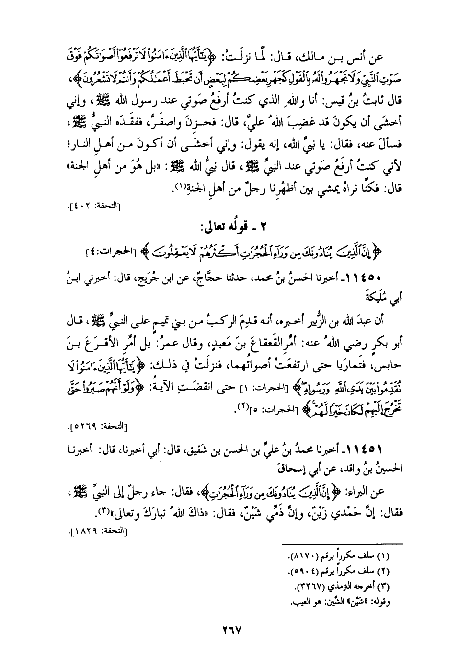 11450 - أَخْبَرَنَا الْحَسَنُ بْنُ مُحَمَّدٍ، حَدَّثَنَا حَجَّاجٌ، عَنِ ابْنِ جُرَيْجٍ، قَالَ: أَخْبَرَنِي ابْنُ أَبِي مُلَيْكَةَ، أَنَّ عَبْدَ اللهِ بْنَ الزُّبَيْرِ أَخْبَرَهُ، أَنَّهُ قَدِمَ الرُّكَبُ مِنْ بَنِي تَمِيمٍ , عَلَى النَّبِيِّ صَلَّى اللهُ عَلَيْهِ وَسَلَّمَ، قَالَ أَبُو بَكْرٍ رَضِيَ اللهُ عَنْهُ: أَمِّرِ الْقَعْقَاعَ بْنَ مَعْبَدٍ، وَقَالَ عُمَرُ: بَلْ أَمِّرِ الْأَقْرَعَ بْنَ حَابِسٍ، فَتَمَارَيَا حَتَّى ارْتَفَعَتْ أَصْوَاتُهُمَا، فَنَزَلَتْ فِي ذَلِكَ {§يَا أَيُّهَا الَّذِينَ آمَنُوا لَا تُقَدِّمُوا بَيْنَ يَدَيِ اللهِ وَرَسُولِهِ} [الحجرات: 1] حَتَّى انْقَضَتِ الْآيَةُ {وَلَوْ أَنَّهُمْ صَبَرُوا حَتَّى تَخْرُجَ إِلَيْهِمْ لَكَانَ خَيْرًا لَهُمْ} [الحجرات: 5]