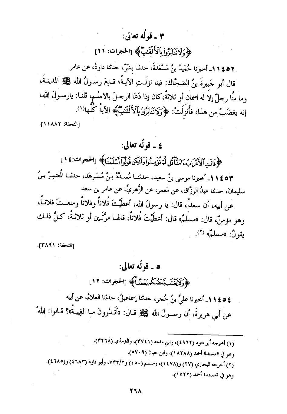 11452 - أَخْبَرَنَا حُمَيْدُ بْنُ مَسْعَدَةَ، حَدَّثَنَا بِشْرٌ، حَدَّثَنَا دَاوُدُ، عَنْ عَامِرٍ، قَالَ أَبُو جَبِيرَةَ بْنُ الضَّحَّاكِ: فِينَا نَزَلَتِ الْآيَةُ، قَدِمَ رَسُولُ اللهِ صَلَّى اللهُ عَلَيْهِ وَسَلَّمَ الْمَدِينَةَ، وَمَا مِنَّا رَجُلٌ إِلَّا لَهُ اسْمَانِ أَوْ ثَلَاثَةٌ، كَانَ إِذَا دَعَا الرَّجُلَ بِالِاسْمِ , قُلْنَا: يَا رَسُولَ اللهِ، إِنَّهُ يَغْضَبُ مِنْ هَذَا، فَأُنْزِلَتْ {§وَلَا تَنَابَزُوا بِالْأَلْقَابِ} [الحجرات: 11] الْآيَةُ كُلُّهَا
