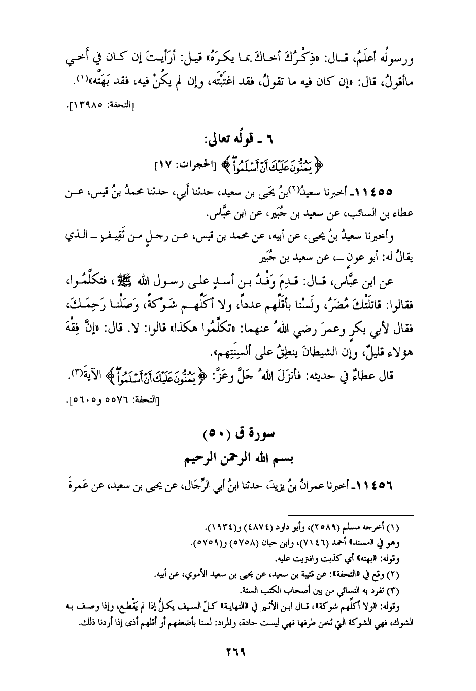 11455 - أَخْبَرَنَا سَعِيدُ بْنُ يَحْيَى بْنِ سَعِيدٍ، حَدَّثَنَا أَبِي، حَدَّثَنَا مُحَمَّدُ بْنُ قَيْسٍ، عَنْ عَطَاءِ بْنِ السَّائِبِ، عَنْ سَعِيدِ بْنِ جُبَيْرٍ، عَنِ ابْنِ عَبَّاسٍ، وَأَخْبَرَنَا سَعِيدُ بْنُ يَحْيَى، عَنْ أَبِيهِ، عَنْ مُحَمَّدِ بْنِ قَيْسٍ، عَنْ رَجُلٍ، مِنْ ثَقِيفٍ الَّذِي يُقَالُ لَهُ أَبُو عَوْنٍ، عَنْ سَعِيدِ بْنِ جُبَيْرٍ، عَنِ ابْنِ عَبَّاسٍ، قَالَ: قَدِمَ وَفْدُ بَنِي أَسَدٍ عَلَى رَسُولِ اللهِ صَلَّى اللهُ عَلَيْهِ وَسَلَّمَ، فَتَكَلَّمُوا , فَقَالُوا: قَاتَلَتْكَ مُضَرُ , وَلَسْنَا بَأَقَلِّهِمْ عَدَدًا، وَلَا أَكَلَّهُمْ شَوْكَةً، وَصَلْنَا رَحِمَكَ، فَقَالَ لِأَبِي بَكْرٍ وَعُمَرَ رَضِيَ اللهُ عَنْهُمَا: «تَكَلَّمُوا هَكَذَا»، قَالُوا: لَا، قَالَ: «إِنَّ فِقْهَ هَؤُلَاءِ قَلِيلٌ، وَإِنَّ الشَّيْطَانَ يَنْطِقُ عَلَى أَلْسِنَتِهِمْ»، قَالَ عَطَاءٌ فِي حَدِيثِهِ: فَأَنْزَلَ اللهُ جَلَّ وَعَزَّ {§يَمُنُّونَ عَلَيْكَ أَنْ أَسْلَمُوا} [الحجرات: 17] الْآيَةَ