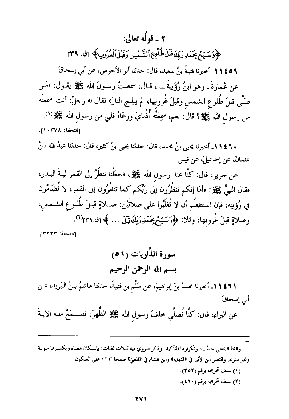 11460 - أَخْبَرَنَا يَحْيَى بْنُ مُحَمَّدٍ، قَالَ: حَدَّثَنَا يَحْيَى بْنُ كَثِيرٍ، قَالَ: حَدَّثَنَا عَبْدُ اللهِ بْنُ عُثْمَانَ، عَنْ إِسْمَاعِيلَ، عَنْ قَيْسٍ، عَنْ جَرِيرٍ، قَالَ: كُنَّا عِنْدَ رَسُولِ اللهِ صَلَّى اللهُ عَلَيْهِ وَسَلَّمَ، فَجَعَلْنَا نَنْظُرُ إِلَى الْقَمَرِ لَيْلَةَ الْبَدْرِ، فَقَالَ النَّبِيُّ صَلَّى اللهُ عَلَيْهِ وَسَلَّمَ: " أَمَا إِنَّكُمْ §تَنْظُرُونَ إِلَى رَبِّكَمْ كَمَا تَنْظُرُونَ إِلَى الْقَمَرِ، لَا تُضَامُّونَ فِي رُؤْيَتِهِ، فَإِنِ اسْتَطَعْتُمْ أَنْ لَا تُغْلَبُوا عَلَى صَلَاتَيْنِ: صَلَاةٍ قَبْلَ طُلُوعِ الشَّمْسِ، وَصَلَاةٍ قَبْلَ غُرُوبِهَا " , وَتَلَا {وَسَبِّحْ بِحَمْدِ رَبِّكَ قَبْلَ} [طه: 130]