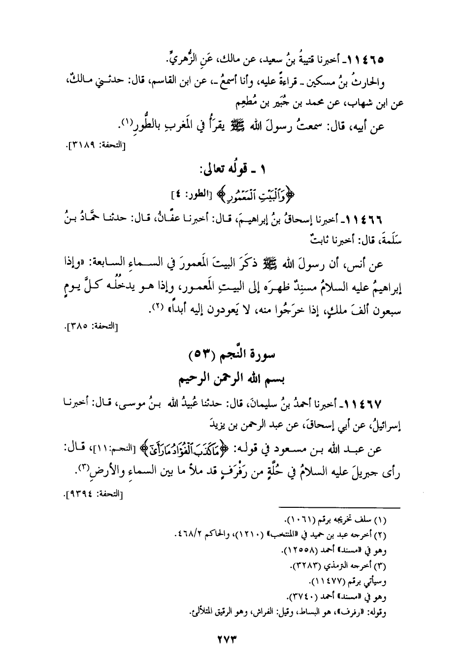 11465 - أَخْبَرَنَا قُتَيْبَةُ بْنُ سَعِيدٍ، عَنْ مَالِكٍ، عَنِ الزُّهْرِيِّ، وَالْحَارِثُ بْنُ مِسْكِينٍ قِرَاءَةً عَلَيْهِ وَأنا أَسْمَعُ، عَنِ ابْنِ الْقَاسِمِ، قَالَ: حَدَّثَنِي مَالِكٌ، عَنِ ابْنِ شِهَابٍ، عَنْ مُحَمَّدِ بْنِ جُبَيْرِ بْنِ مُطْعِمٍ، عَنْ أَبِيهِ، قَالَ: «سَمِعْتُ رَسُولَ اللهِ صَلَّى اللهُ عَلَيْهِ وَسَلَّمَ §يَقْرَأُ فِي الْمَغْرِبِ بِالطُّورِ»
