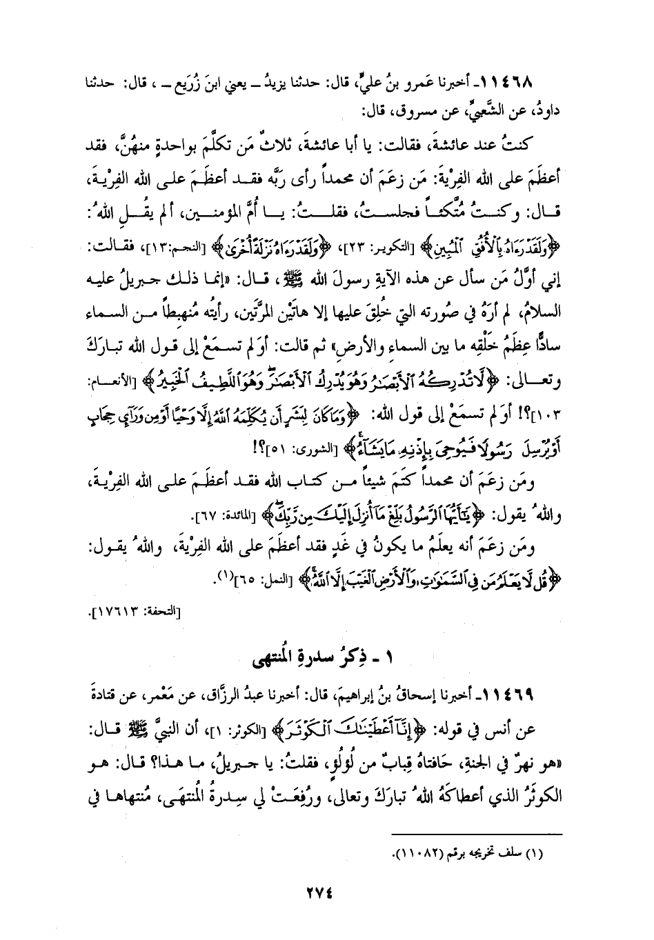 11468 - أَخْبَرَنَا عَمْرُو بْنُ عَلِيٍّ، قَالَ: حَدَّثَنَا يَزِيدُ يَعْنِي ابْنَ زُرَيْعٍ، قَالَ: حَدَّثَنَا دَاوُدُ، عَنِ الشَّعْبِيِّ، عَنْ مَسْرُوقٍ، قَالَ: كُنْتُ عِنْدَ عَائِشَةَ , فَقَالَتْ: يَا أَبَا عَائِشَةَ، ثَلَاثٌ مَنْ تَكَلَّمَ بِوَاحِدَةٍ مِنْهُنَّ فَقَدْ أَعْظَمَ عَلَى اللهِ الْفِرْيَةَ: §مَنْ زَعَمَ أَنَّ مُحَمَّدًا رَأَى رَبَّهُ فَقَدْ أَعْظَمَ عَلَى اللهِ الْفِرْيَةَ، قَالَ: وَكُنْتُ مُتَّكِئًا فَجَلَسْتُ , فَقُلْتُ: يَا أُمَّ الْمُؤْمِنِينَ، أَلَمْ يَقُلِ اللهُ {وَلَقَدْ رَآهُ بِالْأُفُقِ الْمُبِينِ} [التكوير: 23]، {وَلَقَدْ رَآهُ نَزْلَةً أُخْرَى} [النجم: 13]؟ , فَقَالَتْ: " إِنِّي أَوَّلُ مَنْ سَأَلَ عَنْ هَذِهِ الْآيَةِ رَسُولَ اللهِ صَلَّى اللهُ عَلَيْهِ وَسَلَّمَ , قَالَ: «إِنَّمَا ذَلِكَ جِبْرِيلُ عَلَيْهِ السَّلَامُ، لَمْ أَرَهُ فِي صُورَتِهِ الَّتِي خُلِقَ عَلَيْهَا إِلَّا هَاتَيْنِ الْمَرَّتَيْنِ، رَأَيْتُهُ مُنْهَبِطًا مِنَ السَّمَاءِ سَادًّا , عِظَمُ خَلْقِهِ مَا بَيْنَ السَّمَاءِ وَالْأَرْضِ» , ثُمَّ قَالَتْ: أَوَلَمْ تَسْمَعْ إِلَى قَوْلِ اللهِ تَبَارَكَ وَتَعَالَى: {لَا تُدْرِكْهُ الْأَبْصَارُ وَهُوَ يُدْرِكُ الْأَبْصَارَ وَهُوَ اللَّطِيفُ الْخَبِيرُ} [الأنعام: 103]؟، أَوَلَمْ تَسْمَعْ إِلَى قَوْلِ اللهِ: {وَمَا كَانَ لِبَشَرٍ أَنْ يُكَلِّمَهُ اللهُ إِلَّا وَحْيًا أَوْ مِنْ وَرَاءِ حِجَابٍ أَوْ يُرْسِلَ رَسُولًا فَيُوحِيَ بِإِذْنِهِ مَا يَشَاءُ} [الشورى: 51]؟، وَمَنْ زَعَمَ أَنَّ مُحَمَّدًا كَتَمَ شَيْئًا مِنْ كِتَابِ اللهِ فَقَدْ أَعْظَمَ عَلَى اللهِ الْفِرْيَةَ، وَاللهُ يَقُولُ: {يَا أَيُّهَا الرَّسُولُ بَلِّغْ مَا أُنْزِلَ إِلَيْكَ مِنْ رَبِّكَ} [المائدة: 67]، وَمَنْ زَعَمَ أَنَّهُ يَعْلَمُ مَا يَكُونُ فِي غَدٍ , فَقَدْ أَعْظَمَ عَلَى اللهِ الْفِرْيَةَ، وَاللهُ يَقُولُ: {قُلْ لَا يَعْلَمُ مَنْ فِي السَّمَوَاتِ وَالْأَرْضِ الْغَيْبَ إِلَّا اللهُ}