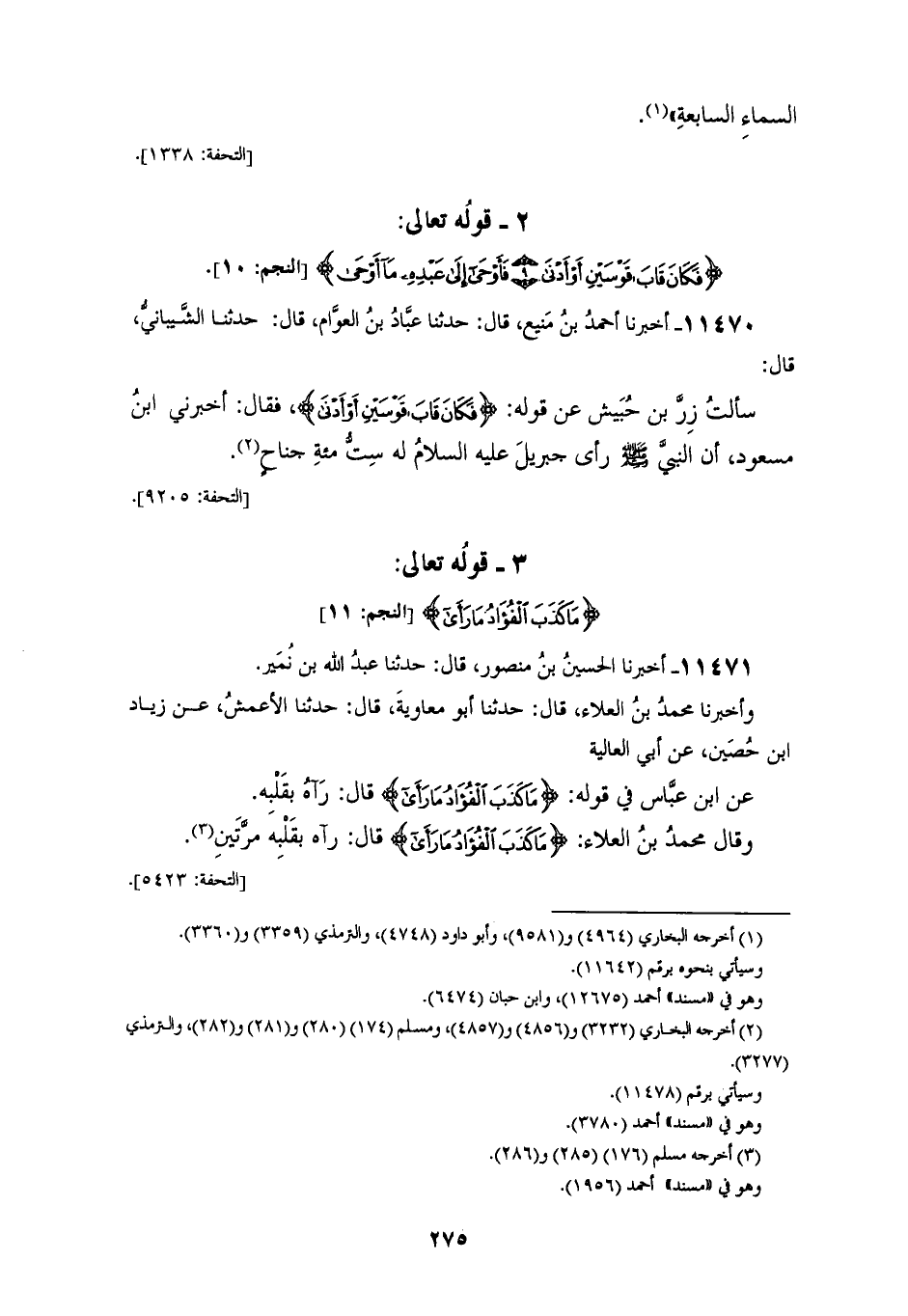 11471 - أَخْبَرَنَا الْحُسَيْنُ بْنُ مَنْصُورٍ، قَالَ: حَدَّثَنَا عَبْدُ اللهِ بْنُ نُمَيْرٍ، وَأَخْبَرَنَا مُحَمَّدُ بْنُ الْعَلَاءِ، قَالَ: حَدَّثَنَا أَبُو مُعَاوِيَةَ، قَالَ: حَدَّثَنَا الْأَعْمَشُ، عَنْ زِيَادِ بْنِ حُصَينٍ، عَنْ أَبِي الْعَالِيَةِ، عَنِ ابْنِ عَبَّاسٍ، فِي قَوْلِهِ: {§مَا كَذَبَ الْفُؤَادُ مَا رَأَى} [النجم: 11] قَالَ: «رَآهُ بِقَلْبِهِ»، وَقَالَ مُحَمَّدُ بْنُ الْعَلَاءِ: {مَا كَذَبَ الْفُؤَادُ مَا رَأَى} [النجم: 11] , قَالَ: «رَآهُ بِقَلْبِهِ مَرَّتَيْنِ»