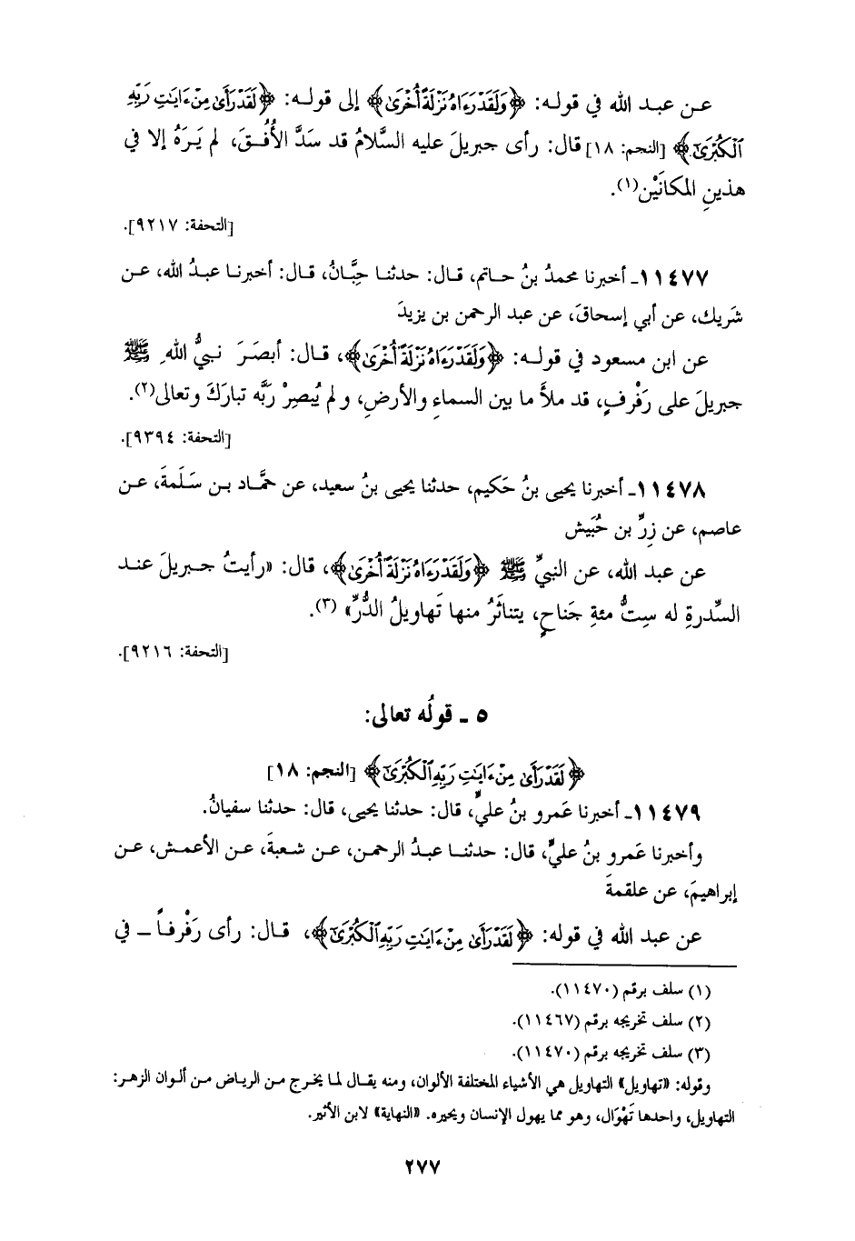11478 - أَخْبَرَنَا يَحْيَى بْنُ حَكِيمٍ، حَدَّثَنَا يَحْيَى بْنُ سَعِيدٍ، عَنْ حَمَّادِ بْنِ سَلَمَةَ، عَنْ عَاصِمٍ، عَنْ زِرِّ بْنِ حُبَيْشٍ، عَنْ عَبْدِ اللهِ، عَنِ النَّبِيِّ صَلَّى اللهُ عَلَيْهِ وَسَلَّمَ {وَلَقَدْ رَآهُ نَزْلَةً أُخْرَى} [النجم: 13] , قَالَ: «§رَأَيْتُ جِبْرِيلَ عِنْدَ السِّدْرَةِ لَهُ سِتُّمِائَةِ جِنَاحٍ , يَتَنَاثَرُ مِنْهَا تَهَاوِيلُ الدُّرِّ»