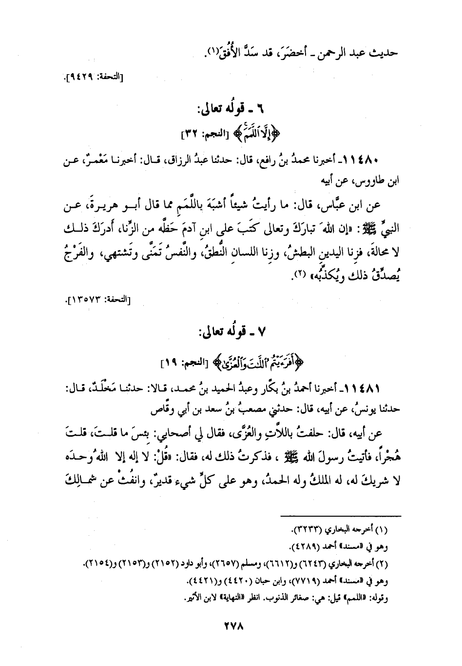 11480 - أَخْبَرَنَا مُحَمَّدُ بْنُ رَافِعٍ، قَالَ: حَدَّثَنَا عَبْدُ الرَّزَّاقِ، قَالَ: أَخْبَرَنَا مَعْمَرٌ، عَنِ ابْنِ طَاوُسٍ، عَنْ أَبِيهِ، عَنِ ابْنِ عَبَّاسٍ، قَالَ: مَا رَأَيْتُ شَيْئًا أَشْبَهَ بِاللَّمَمِ مِمَّا قَالَ أَبُو هُرَيْرَةَ عَنِ النَّبِيِّ صَلَّى اللهُ عَلَيْهِ وَسَلَّمَ: «إِنَّ §اللهَ تَبَارَكَ وَتَعَالَى كَتَبَ عَلَى ابْنِ آدَمَ حَظَّهُ مِنَ الزِّنَا، أَدْرَكَ ذَلِكَ لَا مَحَالَةَ، فَزِنَا الْيَدَيْنِ الْبَطْشُ، وَزِنَا اللِّسَانِ النُّطْقُ، وَالنَّفْسُ تَمَنَّى وَتَشْتَهِي، وَالْفَرْجُ يُصَدِّقُ ذَلِكَ وَيُكَذِّبُهُ»