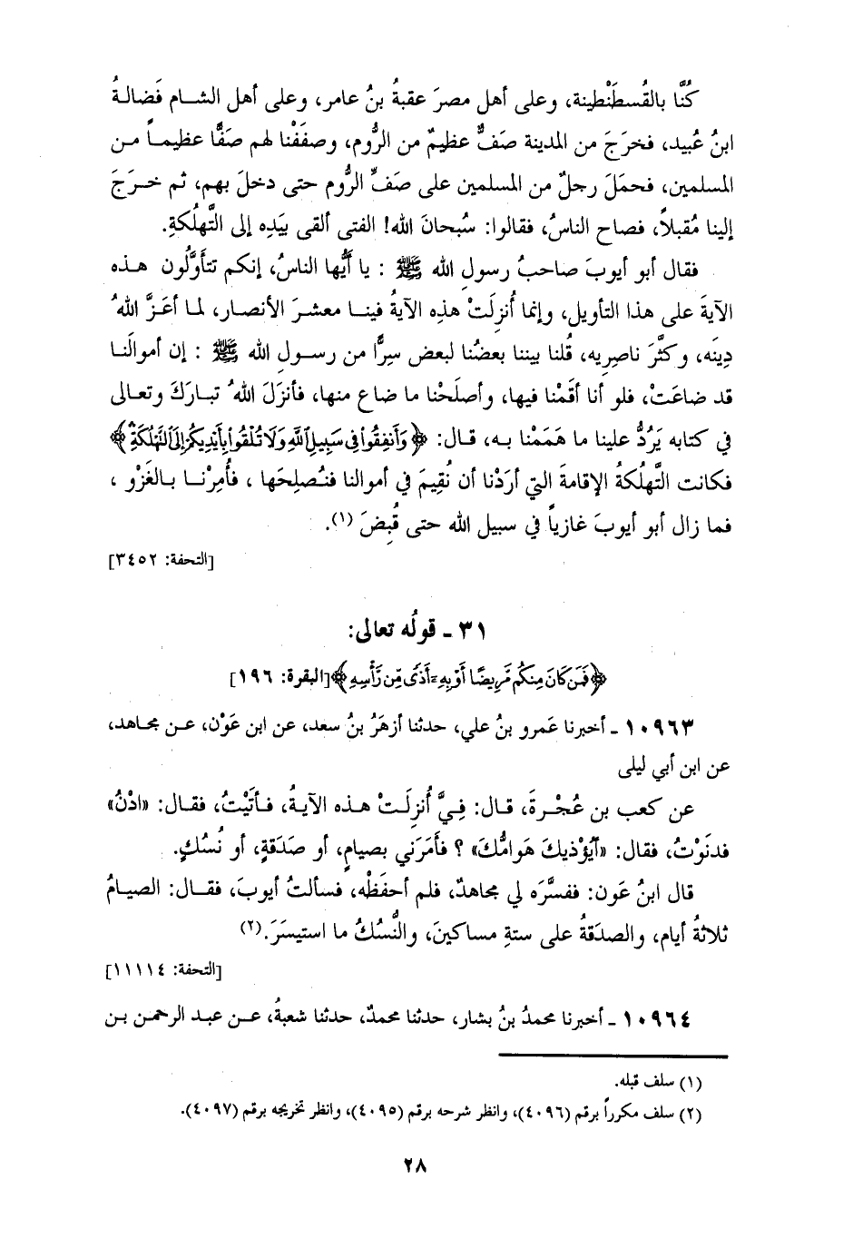 10962 - أَخْبَرَنَا مُحَمَّدُ بْنُ حَاتِمٍ، أَخْبَرَنَا حِبَّانُ، أَخْبَرَنَا عَبْدُ اللهِ، عَنْ حَيْوَةَ، أَخْبَرَنِي يَزِيدُ بْنُ أَبِي حَبِيبٍ، حَدَّثَنَا أَسْلَمُ أَبُو عِمْرَانَ، قَالَ: " كُنَّا بِالْقُسْطَنْطِينَةِ، وَعَلَى أَهْلِ مِصْرَ عُقْبَةُ بْنُ عَامِرٍ، وَعَلَى أَهْلِ الشَّامِ فَضَالَةُ بْنُ عُبَيْدٍ، فَخَرَجَ مِنَ الْمَدِينَةِ صَفٌّ عَظِيمٌ مِنَ الرُّومِ، وَصَفَفْنَا لَهُمْ صَفًّا عَظِيمًا مِنَ الْمُسْلِمِينَ، فَحَمَلَ رَجُلٌ مِنَ الْمُسْلِمِينَ عَلَى صَفِّ الرُّومِ حَتَّى دَخَلَ بِهِمْ، ثُمَّ خَرَجَ إِلَيْنَا مُقْبِلًا، فَصَاحَ النَّاسُ فَقَالُوا: سُبْحَانَ اللهِ، الْفَتَى أَلْقَى بِيَدِهِ إِلَى التَّهْلُكَةِ، فَقَالَ أَبُو أَيُّوبَ صَاحِبُ رَسُولِ اللهِ صَلَّى اللهُ عَلَيْهِ وَسَلَّمَ: يَا أَيُّهَا النَّاسُ، إِنَّكُمْ تَتَأَوَّلُونَ هَذِهِ الْآيَةَ عَلَى هَذَا التَّأْوِيلِ، وَإِنَّمَا أُنْزِلَتْ هَذِهِ الْآيَةُ فِينَا مَعْشَرَ الْأَنْصَارِ لَمَّا أَعَزَّ اللهُ دِينَهُ وَكَثَّرَ نَاصِرِيهِ قُلْنَا بَيْنَنَا بَعْضُنَا لِبَعْضٍ سِرًّا مِنْ رَسُولِ اللهِ صَلَّى اللهُ عَلَيْهِ وَسَلَّمَ: إِنَّ أَمْوَالَنَا قَدْ ضَاعَتْ، فَلَوْ أَنَّا أَقَمْنَا فِيهَا وَأَصْلَحْنَا مَا ضَاعَ مِنْهَا، فَأَنْزَلَ اللهُ تَبَارَكَ وَتَعَالَى فِي كِتَابِهِ يَرُدُّ عَلَيْنَا مَا هَمَمْنَا بِهِ قَالَ: {§وَأَنْفِقُوا فِي سَبِيلِ اللهِ وَلَا تُلْقُوا بِأَيْدِيكُمْ إِلَى التَّهْلُكَةِ} [البقرة: 195] فَكَانَتِ التَّهْلُكَةُ الْإِقَامَةُ الَّتِي أَرَدْنَا أَنْ نُقِيمَ فِي أَمْوَالِنَا فَنُصْلَحَهَا، فَأُمِرْنَا بِالْغَزْوِ، فَمَا زَالَ أَبُو أَيُّوبَ غَازِيًا فِي سَبِيلِ اللهِ حَتَّى قُبِضَ "